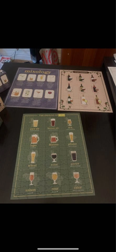 Puzzles completed: beer, wine, and mixology themes. Frames were originally purchased for $20 each. Pick up near 45th and 9th Ave.