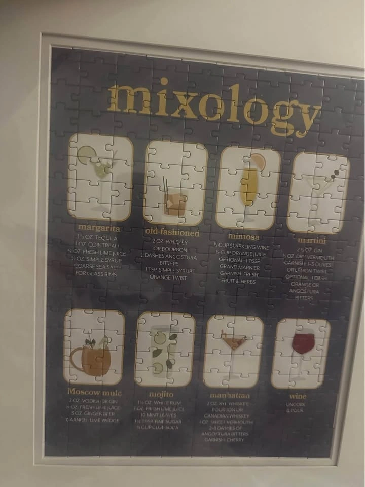 Puzzles completed: beer, wine, and mixology themes. Frames were originally purchased for $20 each. Pick up near 45th and 9th Ave.
