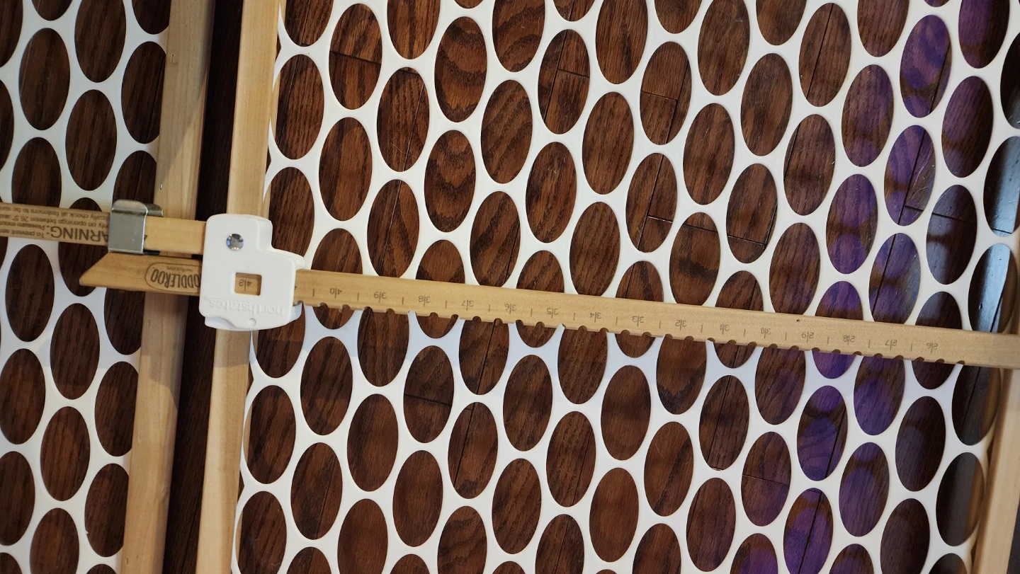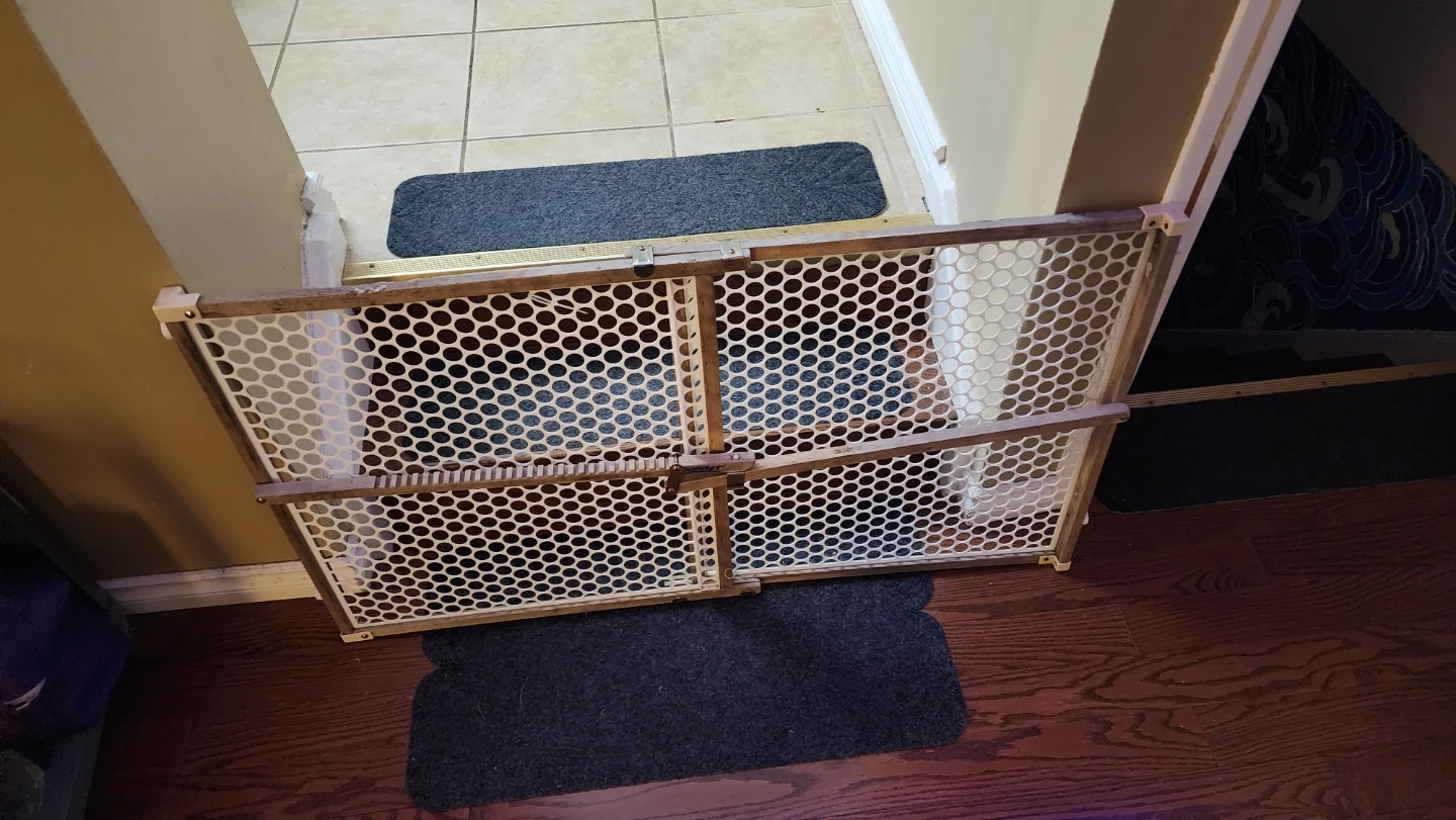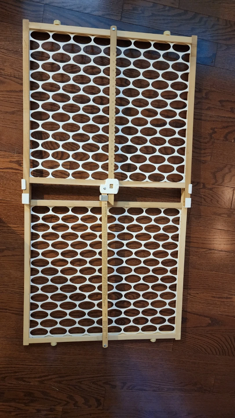 This is a wooden baby safety gate. It's a pressure-mounted gate, 23 inches tall, and 42 inches wide at this widest setting. The gate features a white plastic grid design within a wooden frame. It's suitable for keeping little ones safe. Or for pets as well, second identical gate $10 extra, weathered from being left outside.