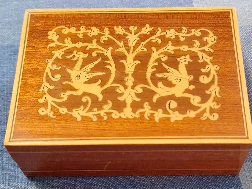 This charming wooden box features a beautiful inlaid design of birds and foliage. It's perfect for storing small treasures or keepsakes. The intricate marquetry showcases skilled craftsmanship.