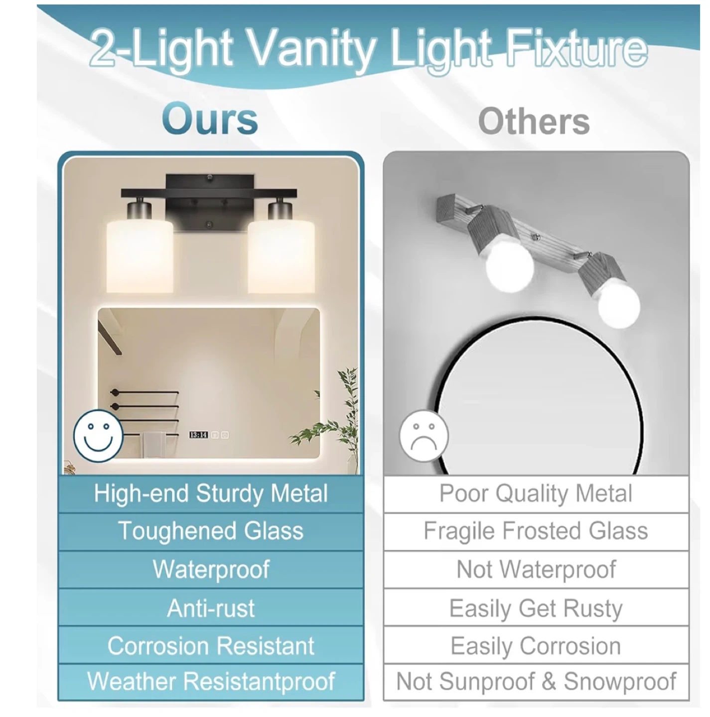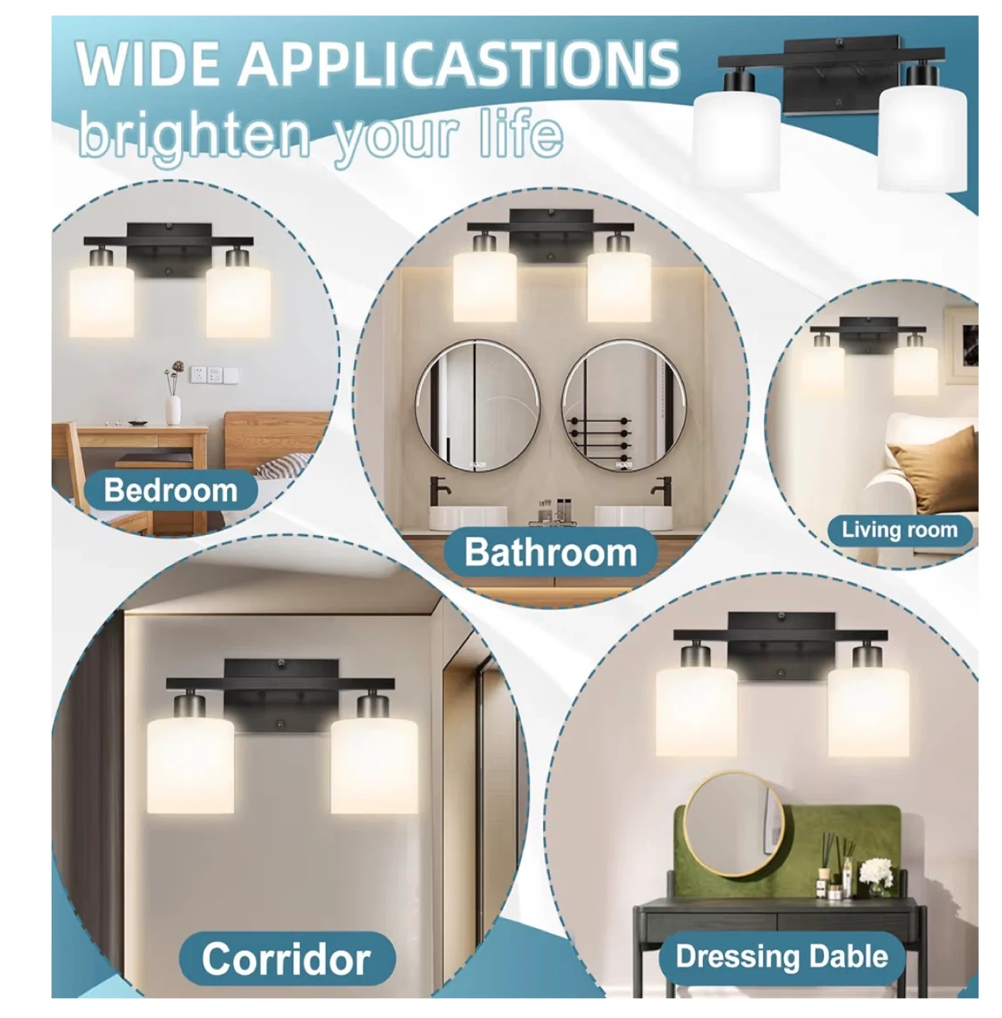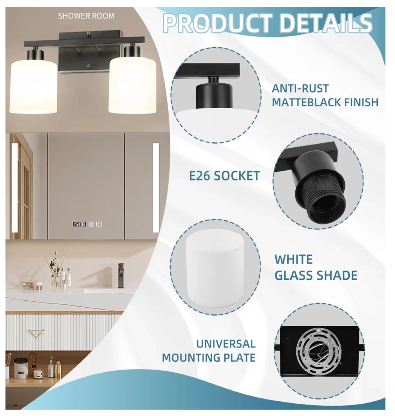 This is a 2-light vanity light fixture with a matte black finish. It features white glass shades and E26 sockets. The fixture has an anti-rust and corrosion-resistant design. Mounting plate is universal.
