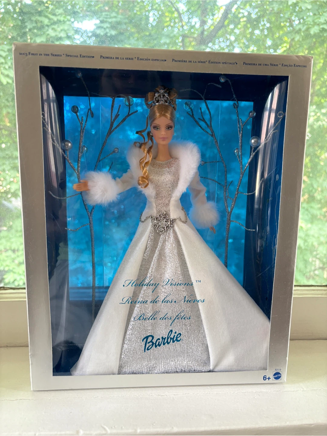 Selling a beautiful 2003 Holiday Visions Barbie, the first in the special edition series! This Barbie is dressed in a stunning white and silver gown with fur accents. Perfect for collectors or as a special gift!