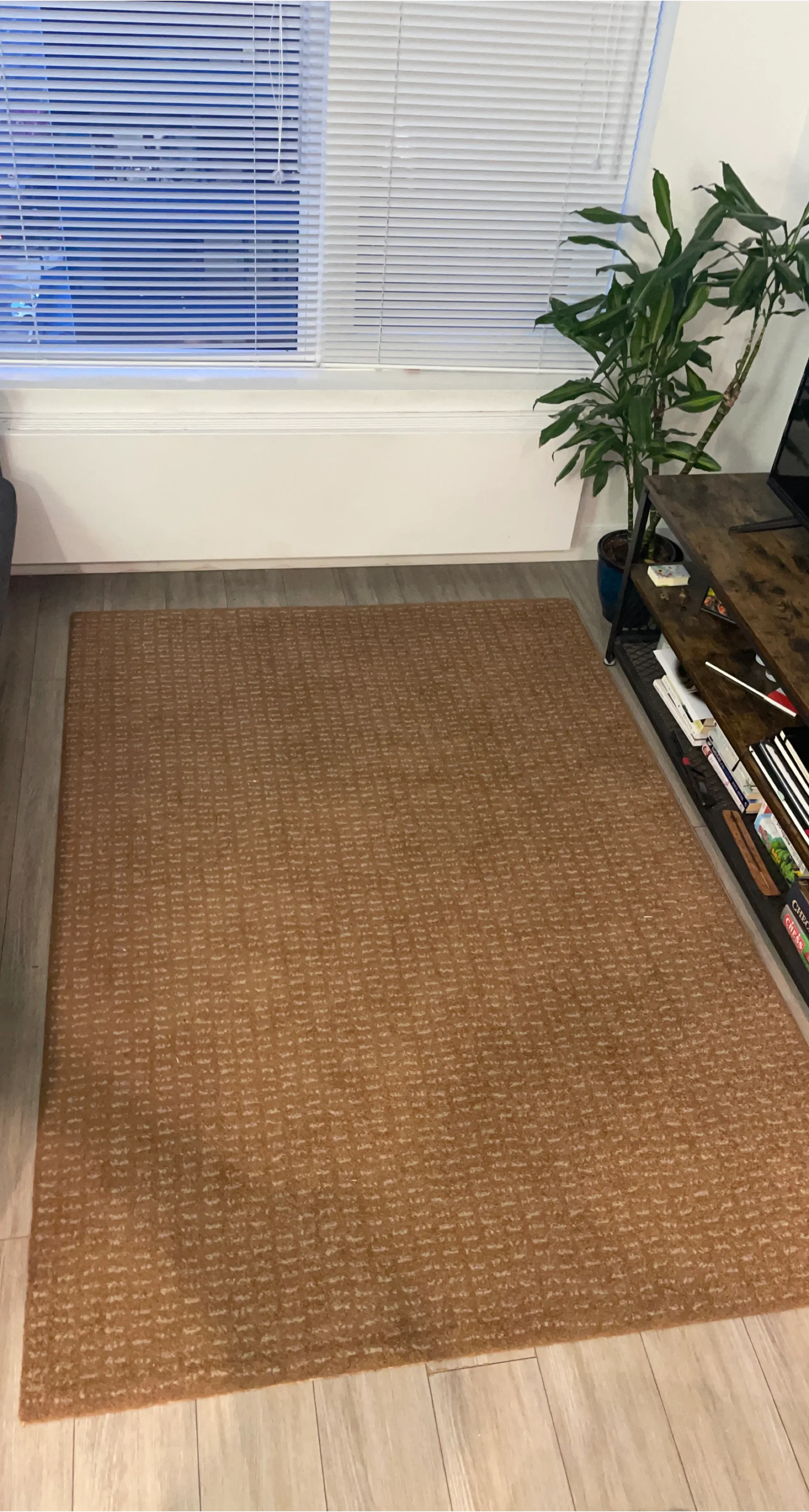 Brown area rug with a subtle textured pattern. Its size is suitable for living areas. This rug would be useful for adding warmth and comfort to your space.