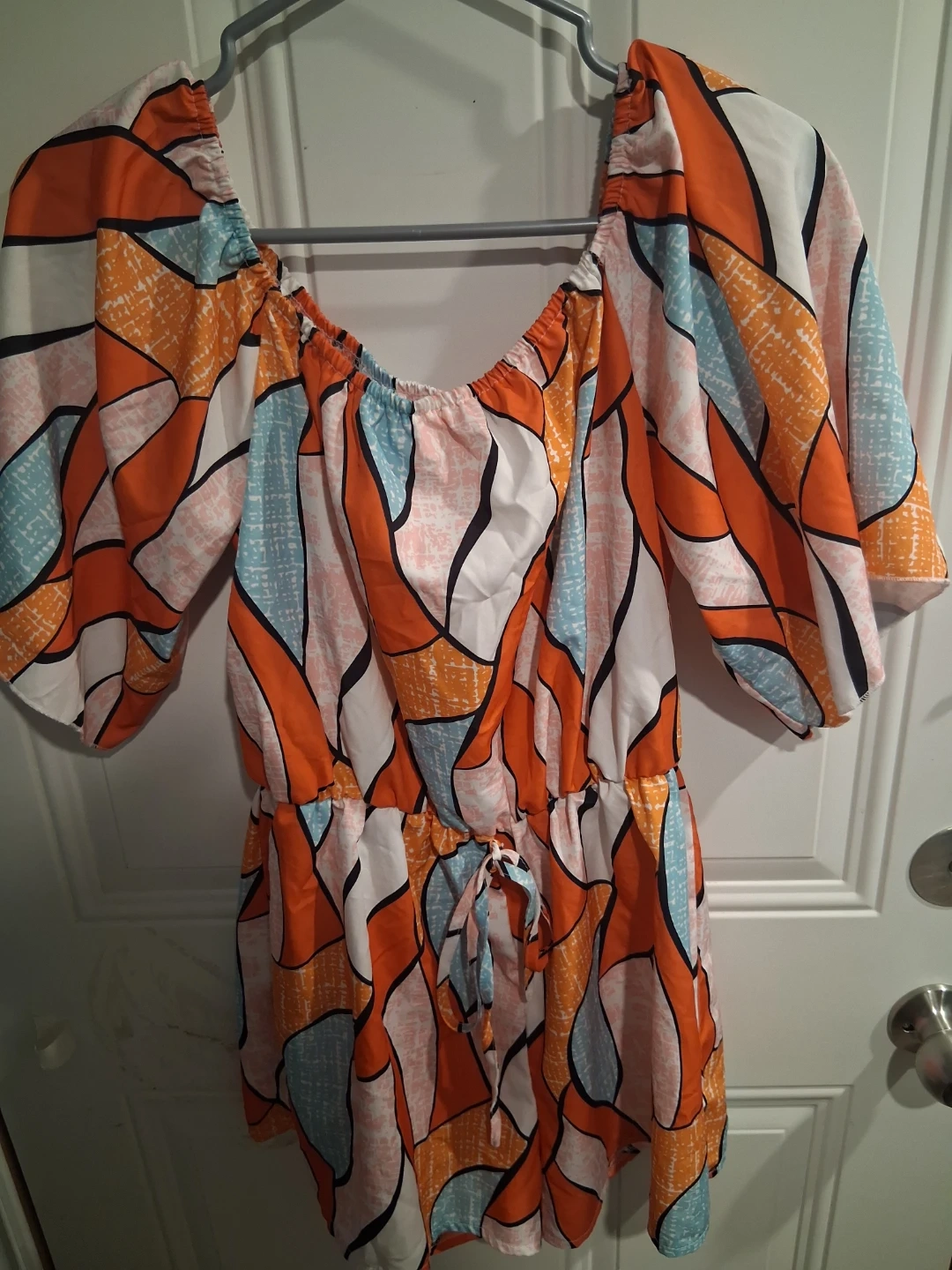 This romper features a vibrant abstract print. It has an off-the-shoulder neckline with elastic. A drawstring waist cinches the fit. Material looks like polyester.