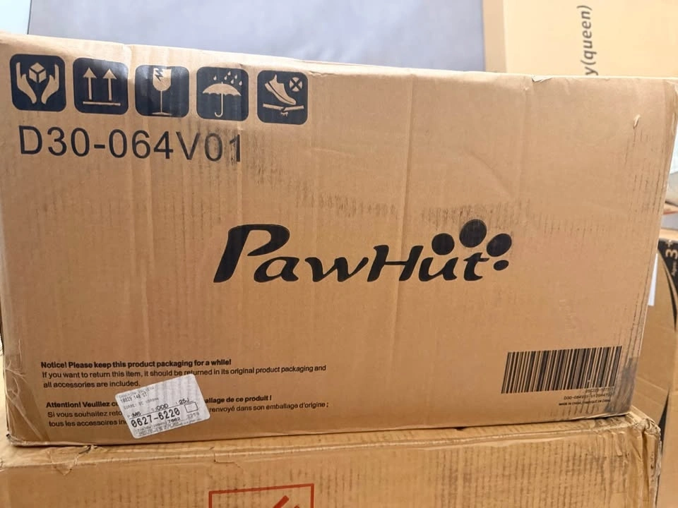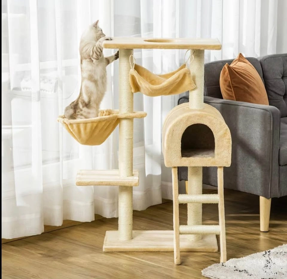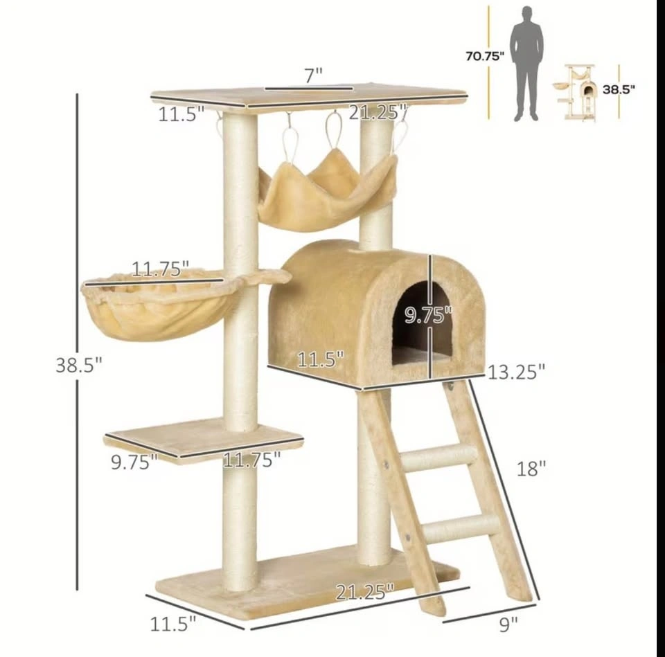 Brand new PawHut cat tree condo. Features multiple levels for your cat to explore, including scratching posts, a hammock, a basket, a hideaway house, and a ladder. Beige color. Stands 38.5 inches tall with a base of 21.25 inches by 11.5 inches. Your furry friend will love this!