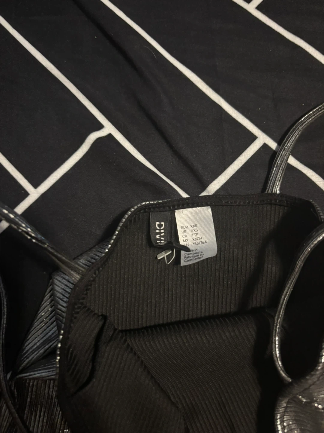 This sparkly silver mini dress features a ribbed texture and a side slit. It has thin spaghetti straps and a fitted silhouette. It's a size XXS.
