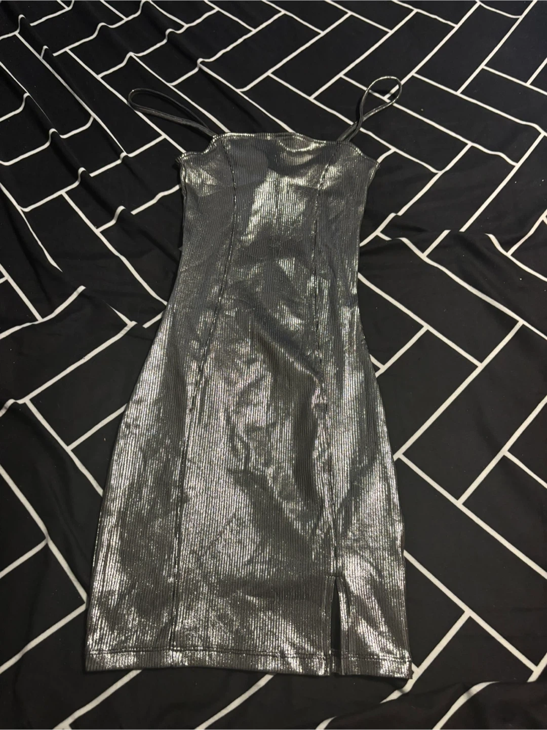 This sparkly silver mini dress features a ribbed texture and a side slit. It has thin spaghetti straps and a fitted silhouette. It's a size XXS.