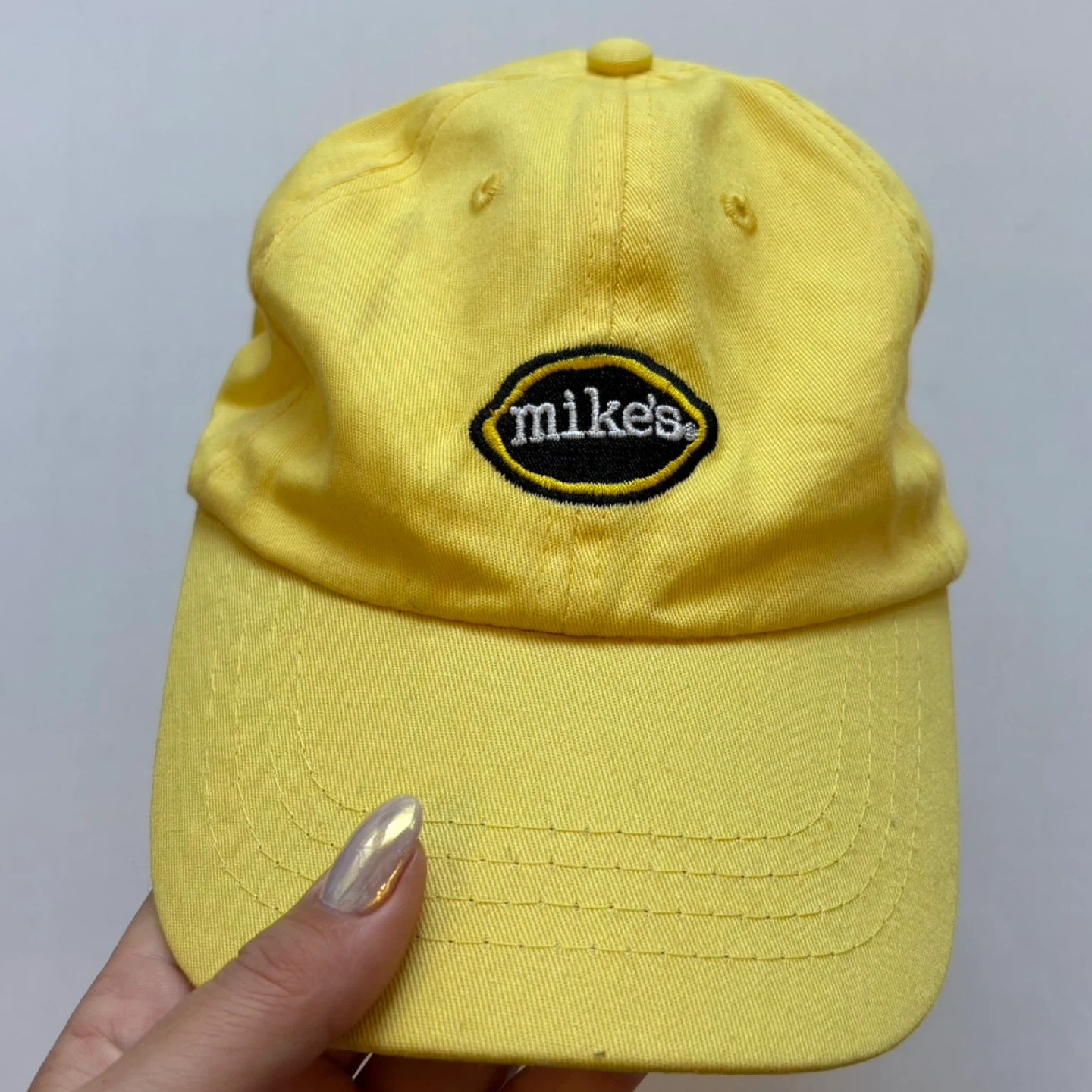 Keywords: Mike's Hard Lemonade, Mike's Hat, Yellow Baseball Cap, Dad Hat, Adjustable, Promotional Merch, Promo Hat, Beverage Brand, Summer Hat, Festival Gear, Embroidered Logo, Unisex, Streetwear, Casual, Bright Yellow, Buckle Closure, Collectible