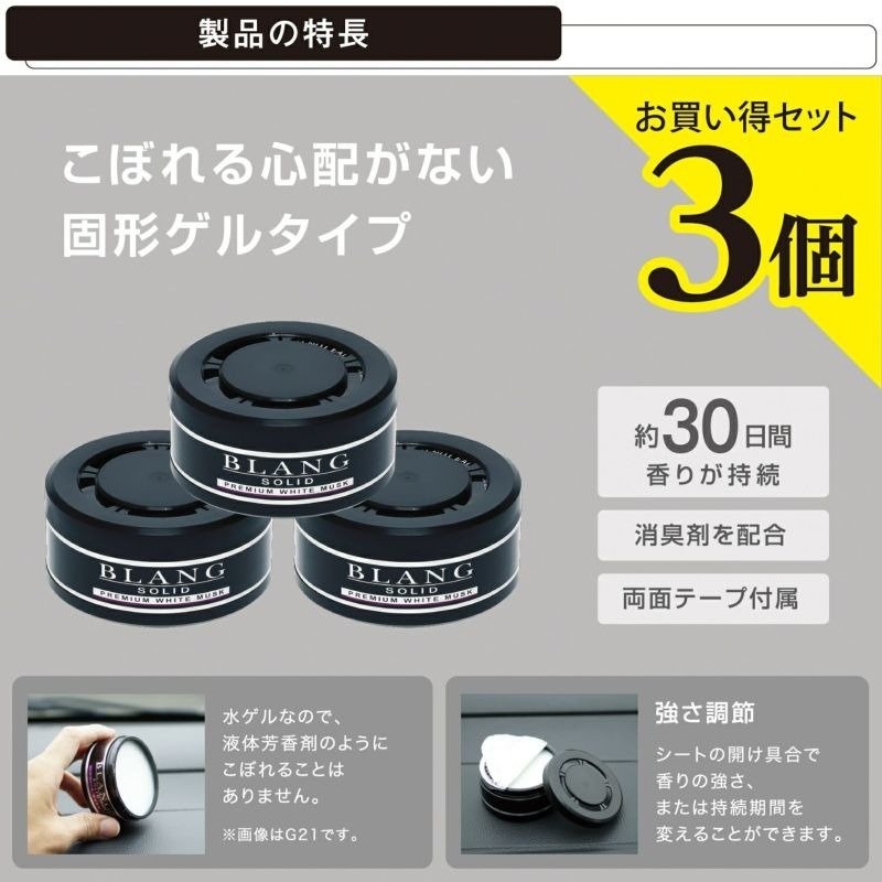 The low-center-of-gravity round design allows for easy installation. The cushioned double-sided tape securely attaches to the dashboard. The 68mm diameter fits any car drink holder. The double-sided tape includes a cushion for secure attachment to the dashboard, preventing residue when removed. *Dashboards with soft surfaces that dent slightly when pressed with your finger may be damaged when removing the adhesive tape. ●Contents: 60g x 3 bottles ●Lasts approximately 30 days per bottle. *Lasts may vary depending on usage environment. ●Rich Premium White Musk Scent: This premium white musk scent, based on the popular white musk scent, blends clean white rose and sandalwood for a pleasantly sweet experience. Contains natural fragrances extracted from high-quality ingredients. [TOP NOTE] Green apple, raspberry [MIDDLE NOTE] Lily of the valley, white rose, jasmine, rose [LAST NOTE] Musk, sandalwood, amber. * Dashboards with soft surfaces that dent slightly when pressed with your finger may be damaged when removing the adhesive tape due to aging. Please apply the tape to a location other than the dashboard. *Please be especially careful with imported vehicles. Do not install in locations that may interfere with airbag deployment or driving, or on the dashboard or footwell on the driver's side (there is a danger of getting caught in the pedals in the event of a rollover). Do not install multiple units in vehicles with large interiors such as minivans.