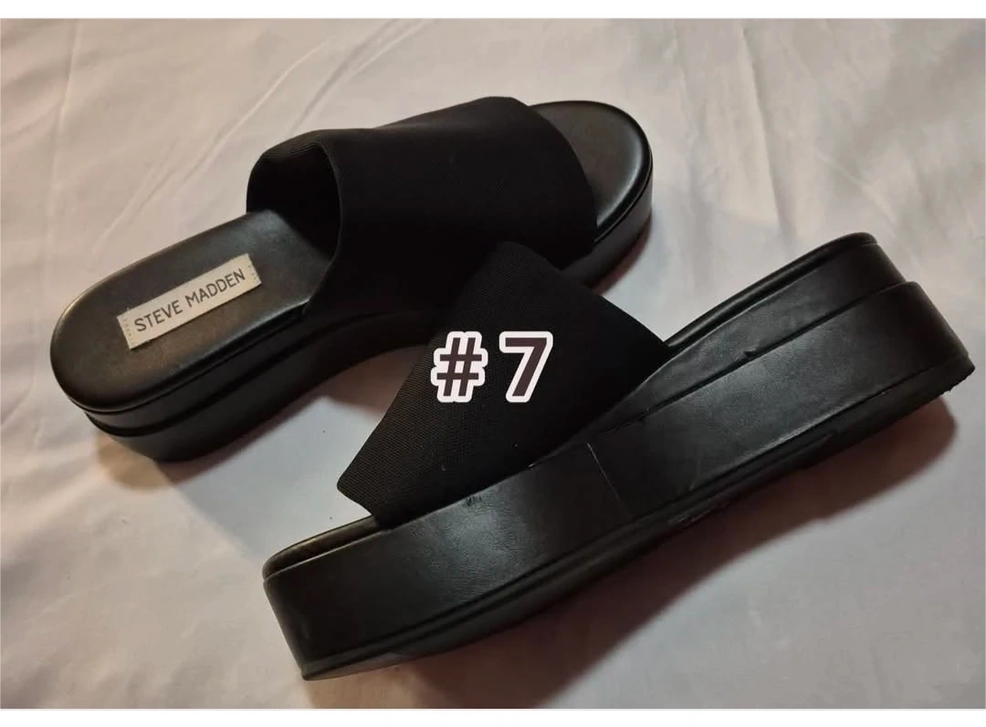 These are black Steve Madden platform slide sandals. The top band is made of stretchy fabric and it's a slip-on style. The platform sole offers a bit of height.