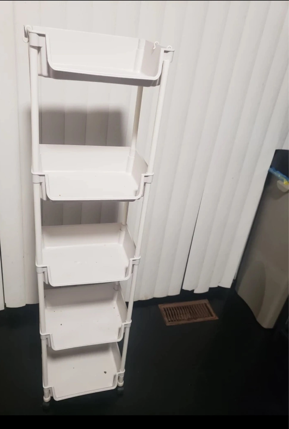 Selling a handy white 5-tier storage rack! It's perfect for organizing items in a small space. It's in good condition and ready for a new home.