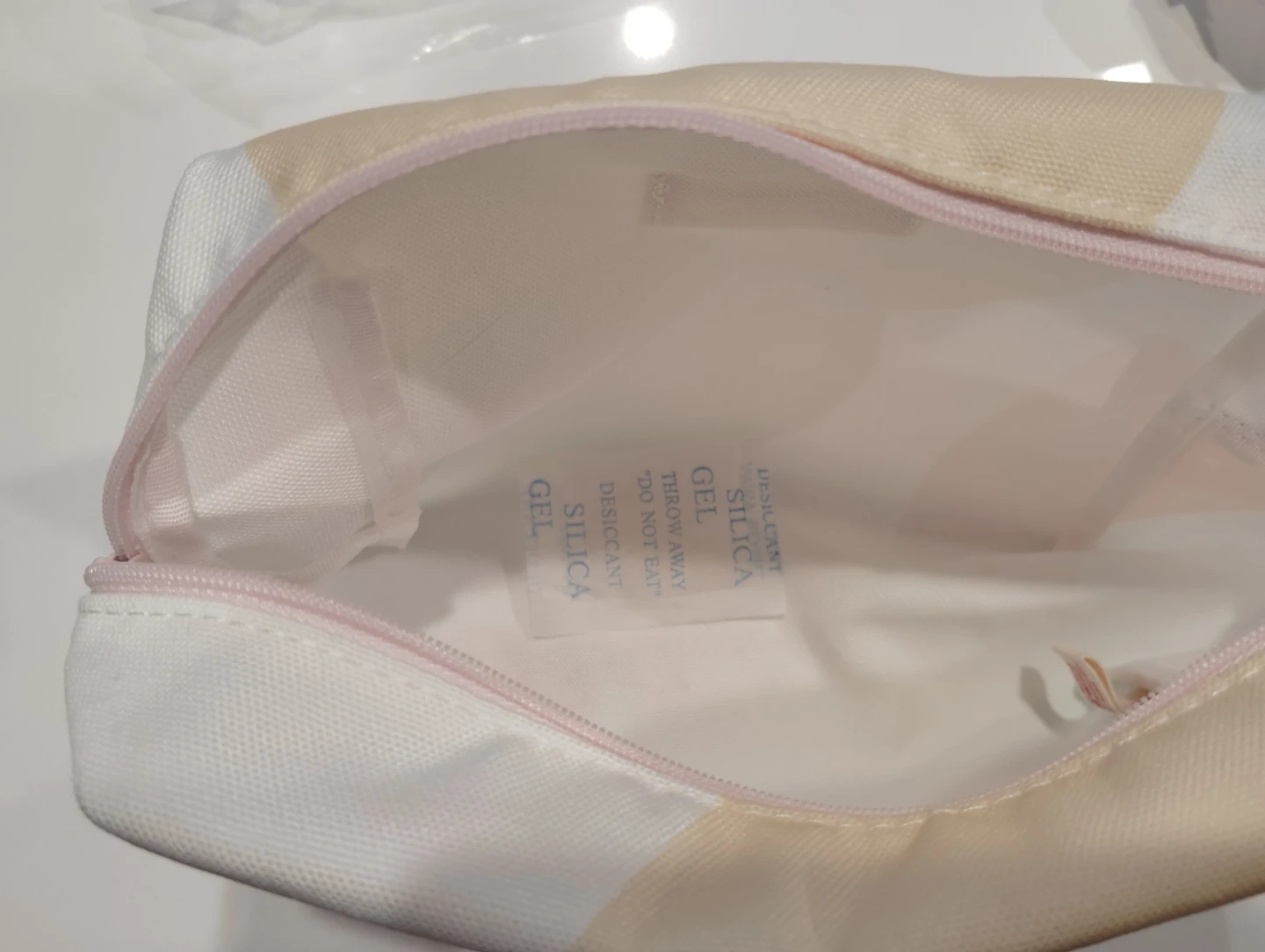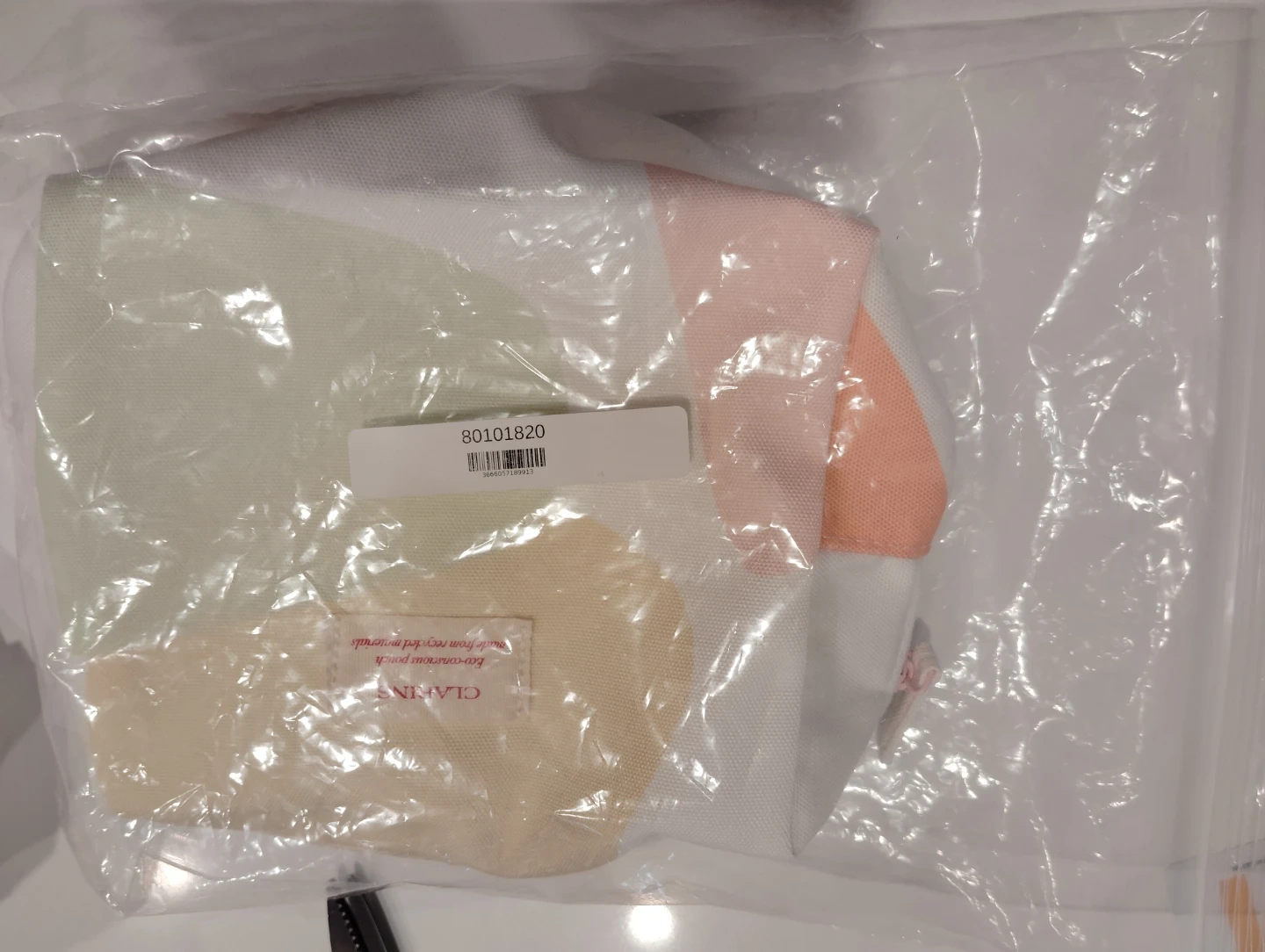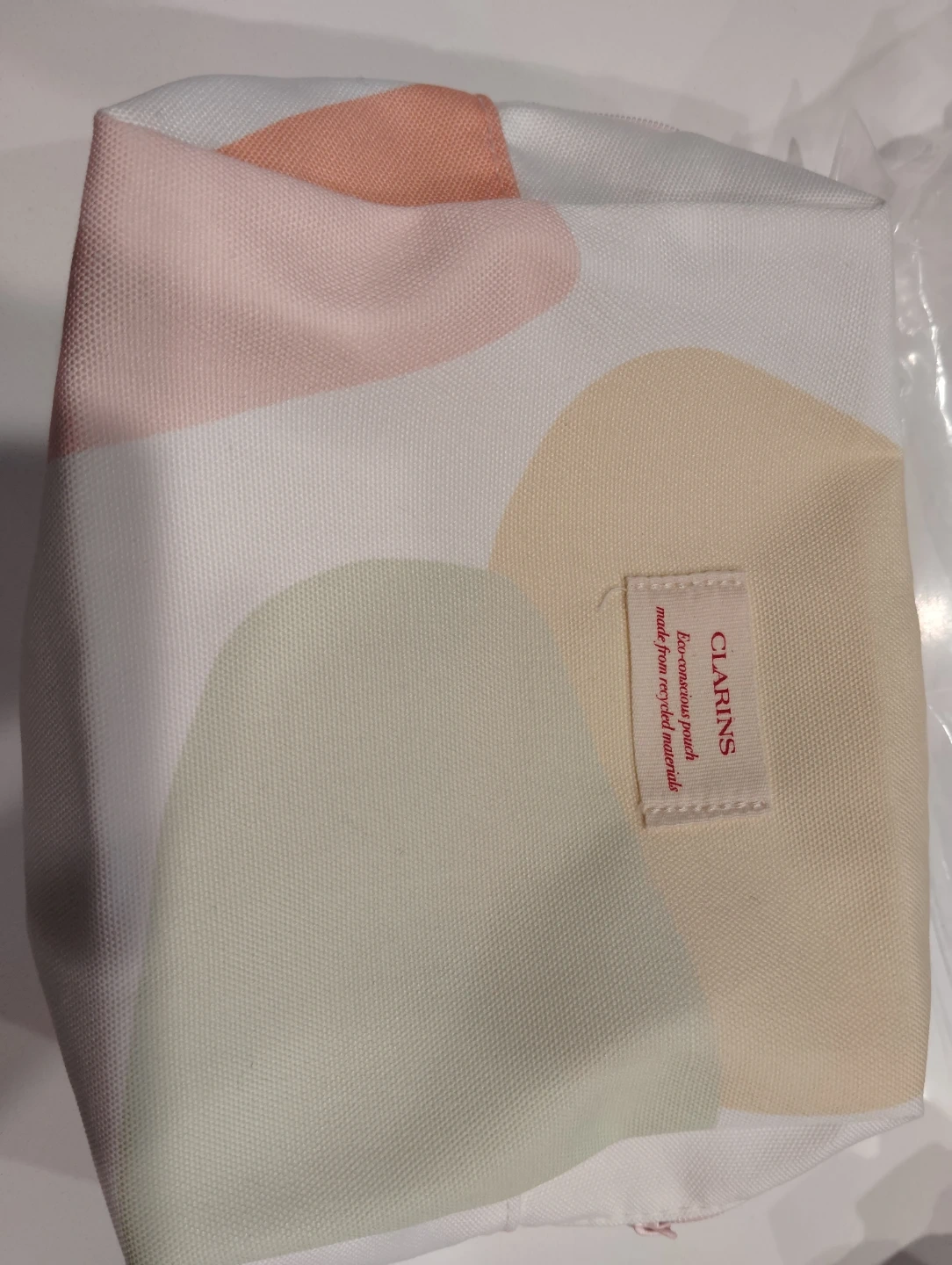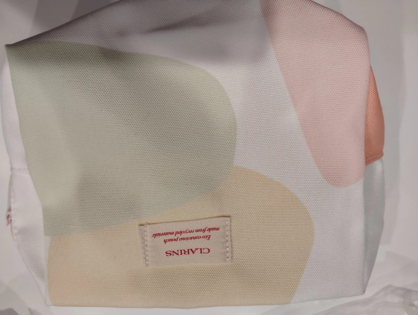Clarins cosmetic pouch made from recycled materials. This bag is designed for convenient storage of makeup and toiletries. It features a zip closure and a durable fabric construction.
