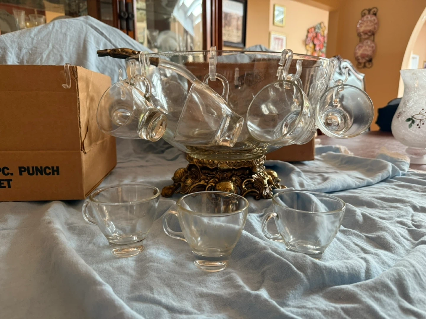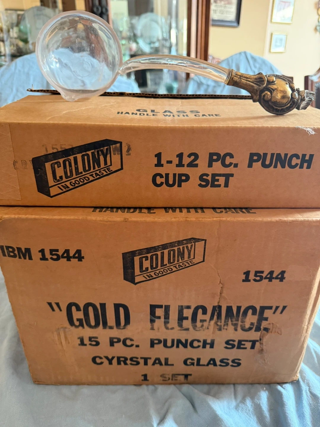 Selling a Vintage Colony "Gold Elegance" 15-piece crystal glass punch set! It comes with the punch bowl, cups, and the ladle. The set is in its original box, ready for your next gathering! Except for one broken cup clip the set is in excellent condition.
