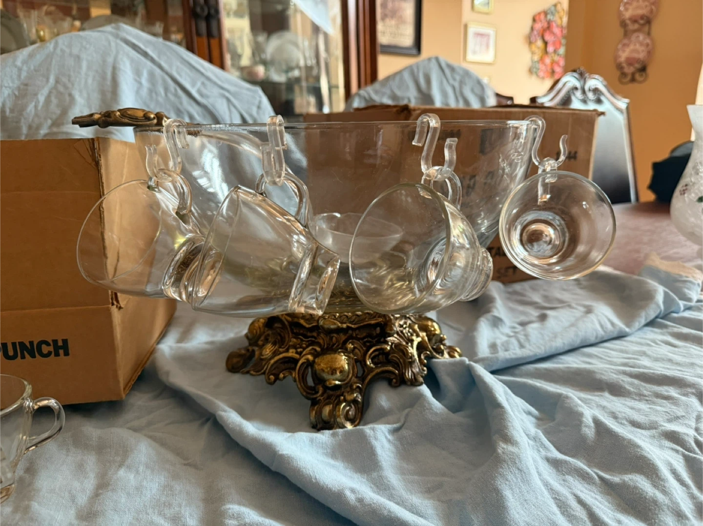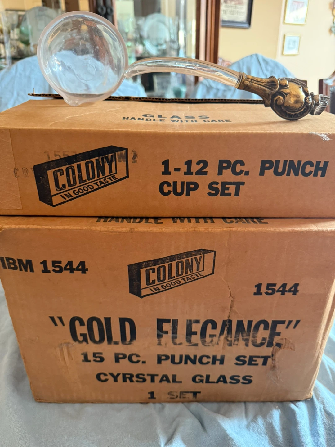 Selling a Vintage Colony "Gold Elegance" 15-piece crystal glass punch set! It comes with the punch bowl, cups, and the ladle. The set is in its original box, ready for your next gathering! Except for one broken cup clip the set is in excellent condition.