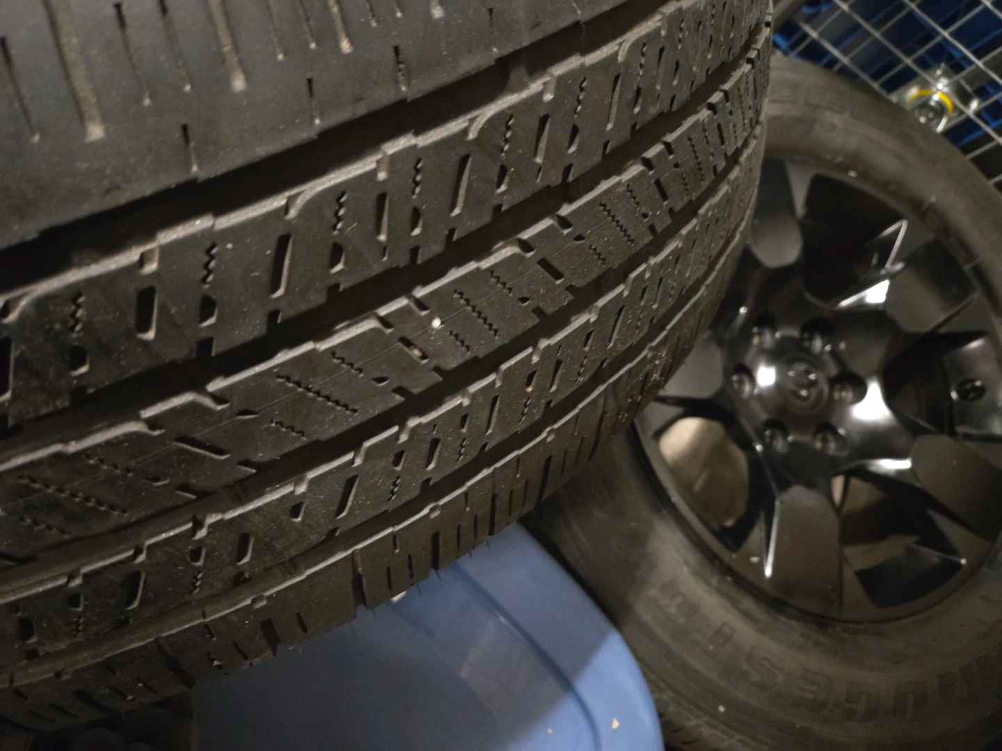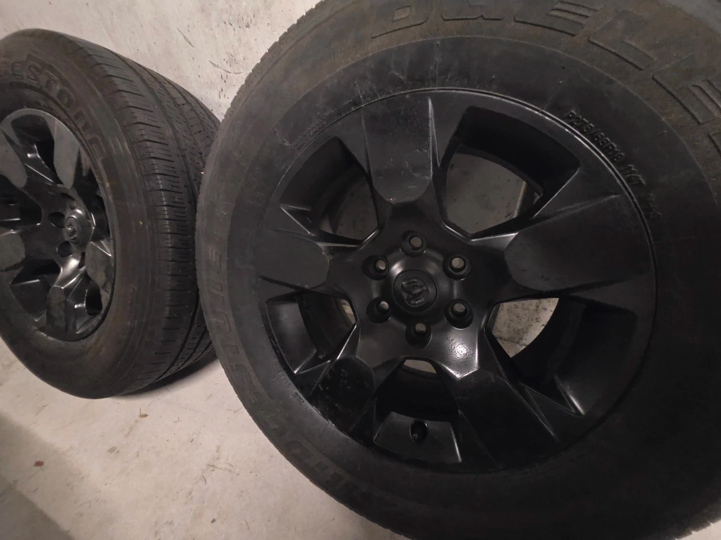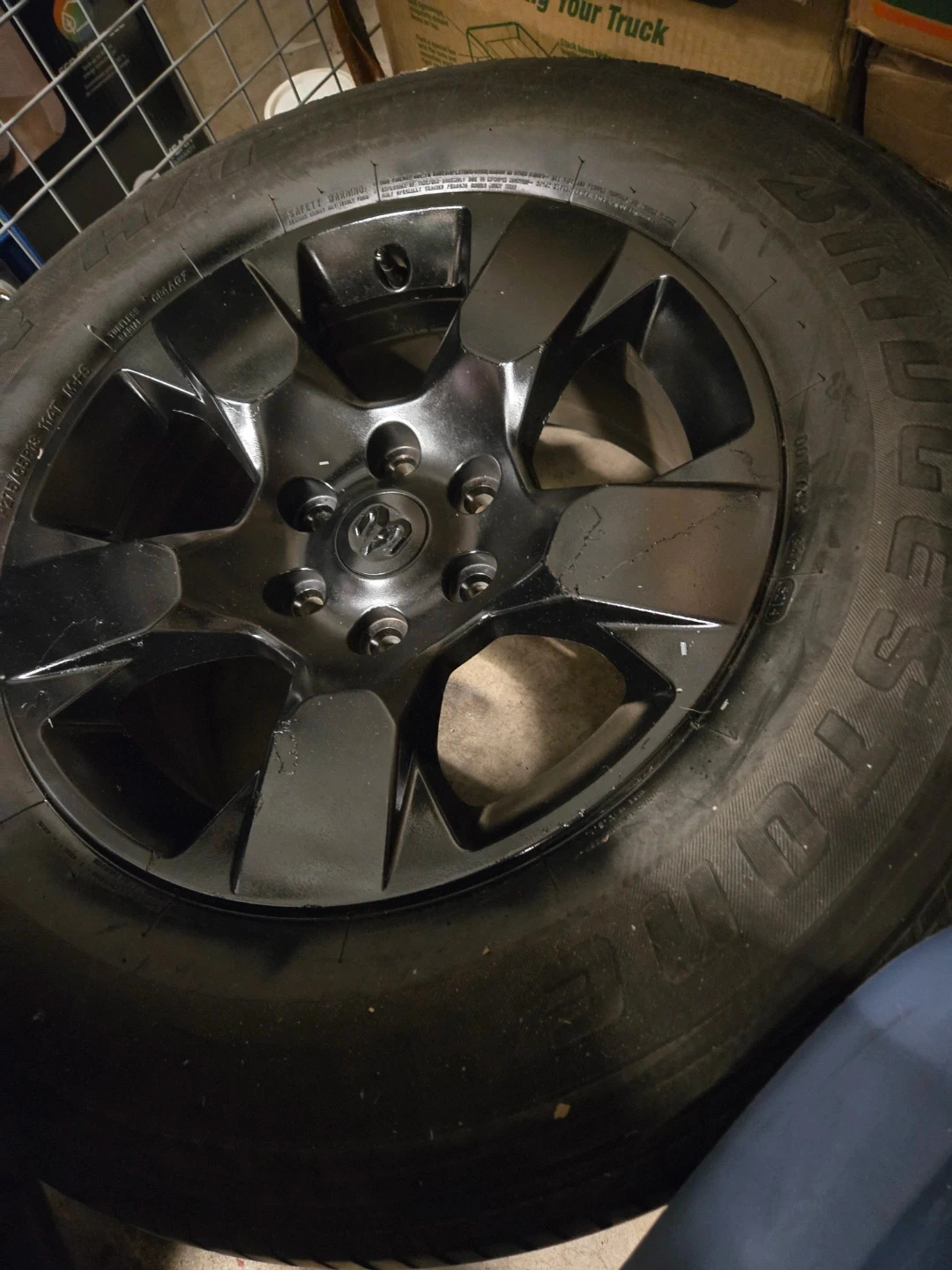 Set of four black alloy wheels bolt pattern 6 x 139.7 with Bridgestone tires 275/65R18 50% tread life. These were off a RAM truck. Tread is in good condition. TPMS are included in the package