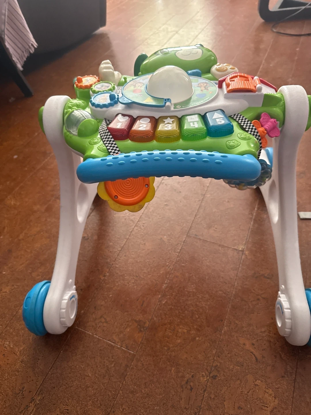This LeapFrog activity walker is designed to help little ones learn and play. It features a piano keyboard, spinning gears, and colourful buttons for interactive fun. It's great for babies just learning to stand and take their first steps!
