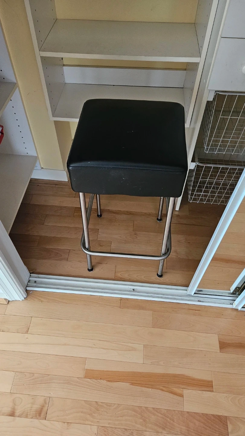 A simple black square bar stool with a padded seat and chrome legs. It's great for a kitchen island or home bar area. Footrest included.