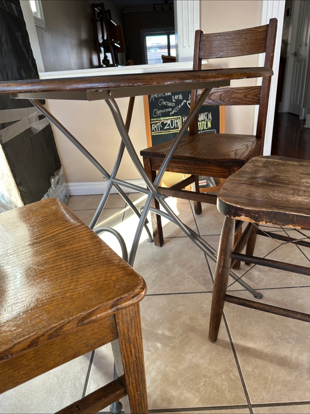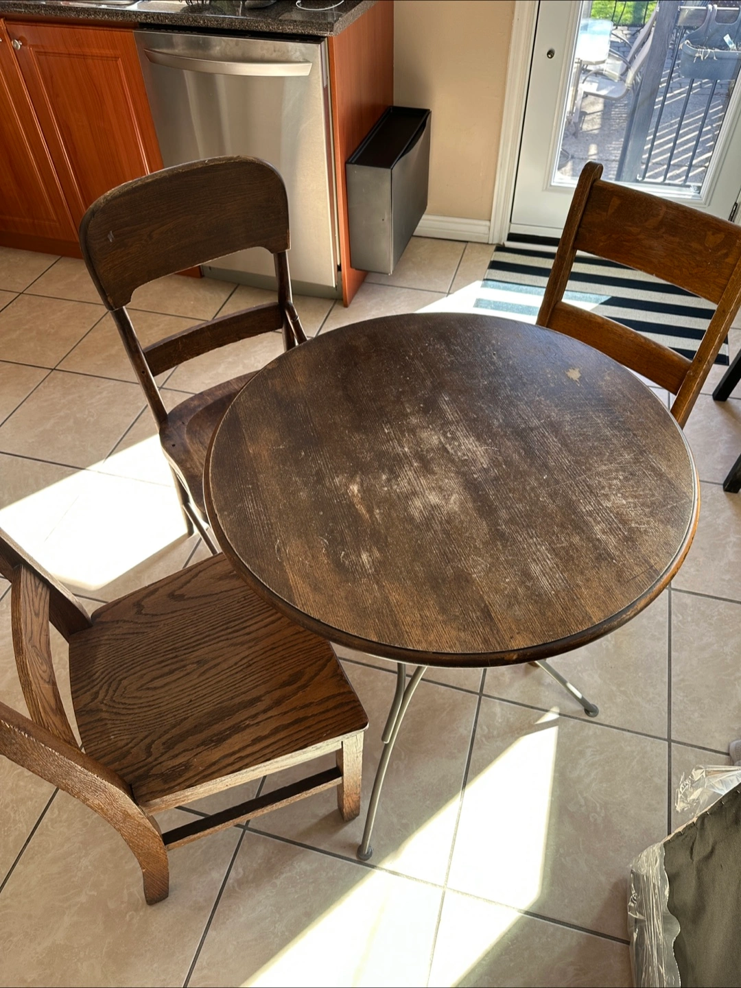 Three vintage wooden chairs and a small round table. Solid wood construction. Shows signs of age and use. Great for a small space or cafe setting. Perfect for a vintage or rustic decor. Pickup near Rogers and Dufferin.