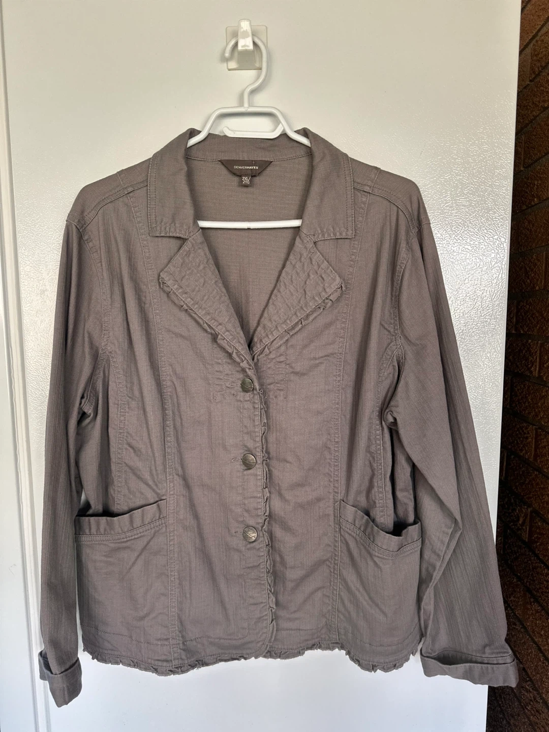 DENVERHARTES button-up jacket in a size 2XL. Features a grey colour and distressed hem detail. This jacket has a comfortable, casual style. New without tags.