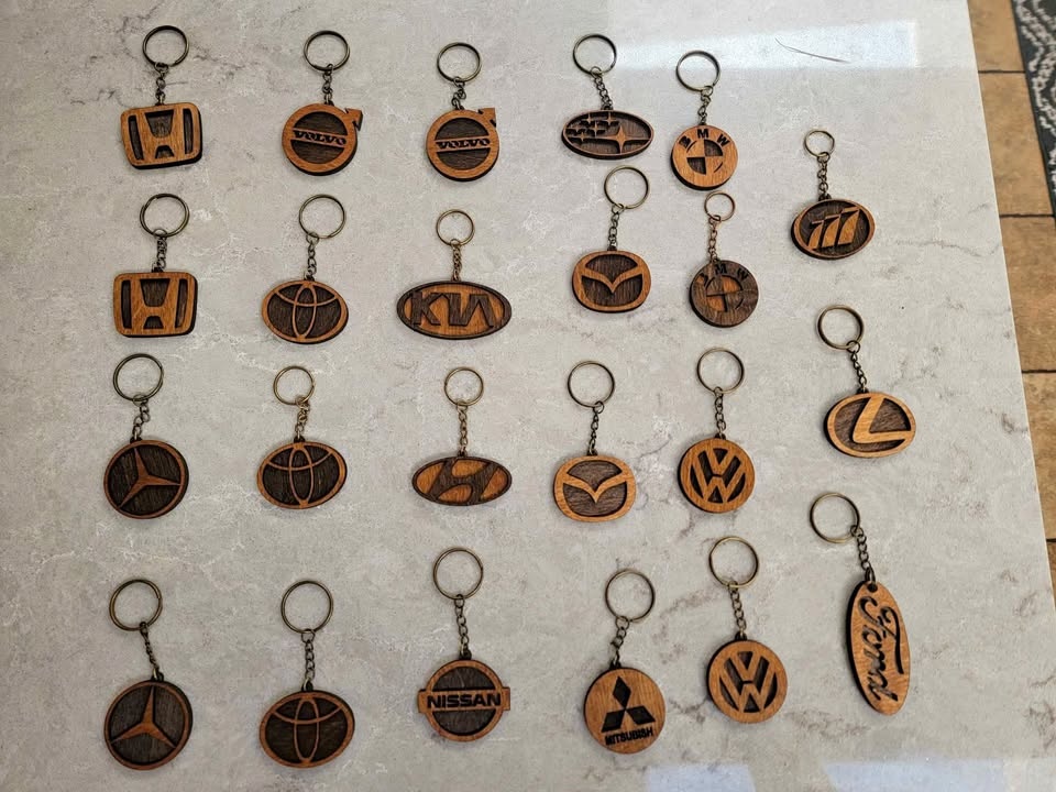 Custom made vehicle brand keychains. If you don't see your brand of Vehicle, send me a message to see if I can make one for you. With advance orders, I can even custom engrave a name or business on the back, along with a contact number or email in case you lose your keys. These are very elegantly styled and can be ordered with three sizes of ring diameters: 30mm, 20mm, or 15mm. I am also flexible with stain or paint choices. Price is per keychain. Feel free to message if you have any questions!