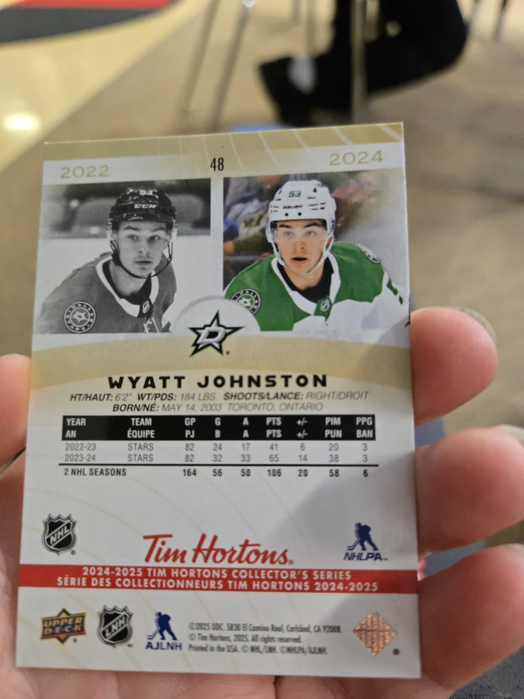 This is a 2022 Tim Hortons Collector's Series hockey card featuring Wyatt Johnston. It highlights his rookie year and includes stats from his NHL seasons. The card is part of the 2024-2025 Tim Hortons Collector's Series.