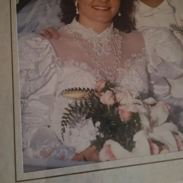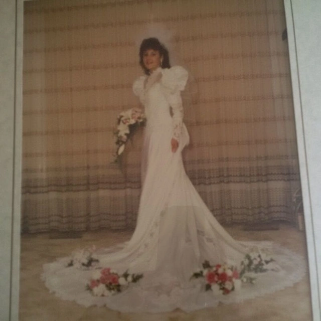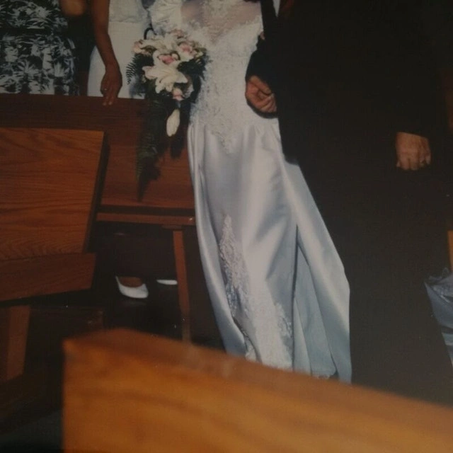 Picture yourself in a beautiful wedding dress hand-picked by you on YOUR wedding day! So much anticipation and fun! But tiring. Wouldn't it be great to be able to remove that beautiful but heavy train and enjoy the reception; dancing away the night? With this beautiful dress, that is possible!! Dry cleaned and properly stored. Beautiful white wedding dress with lots of bead work and crystals. Lots of material to work with to alter for your taste specifically. Fits a size 5, 5'1" woman. Unique removable train leaves tube skirted dress underneath that is super easy to wear the rest of the night.