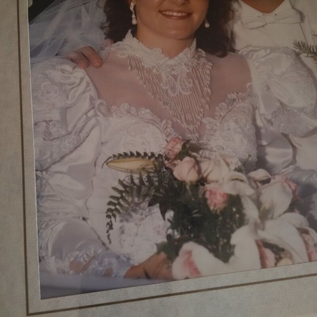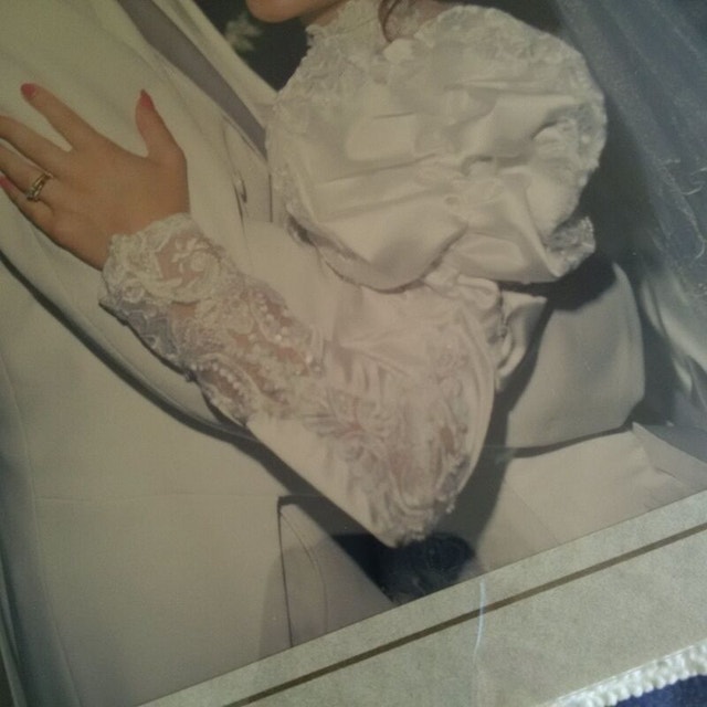 Picture yourself in a beautiful wedding dress hand-picked by you on YOUR wedding day! So much anticipation and fun! But tiring. Wouldn't it be great to be able to remove that beautiful but heavy train and enjoy the reception; dancing away the night? With this beautiful dress, that is possible!! Dry cleaned and properly stored. Beautiful white wedding dress with lots of bead work and crystals. Lots of material to work with to alter for your taste specifically. Fits a size 5, 5'1" woman. Unique removable train leaves tube skirted dress underneath that is super easy to wear the rest of the night.