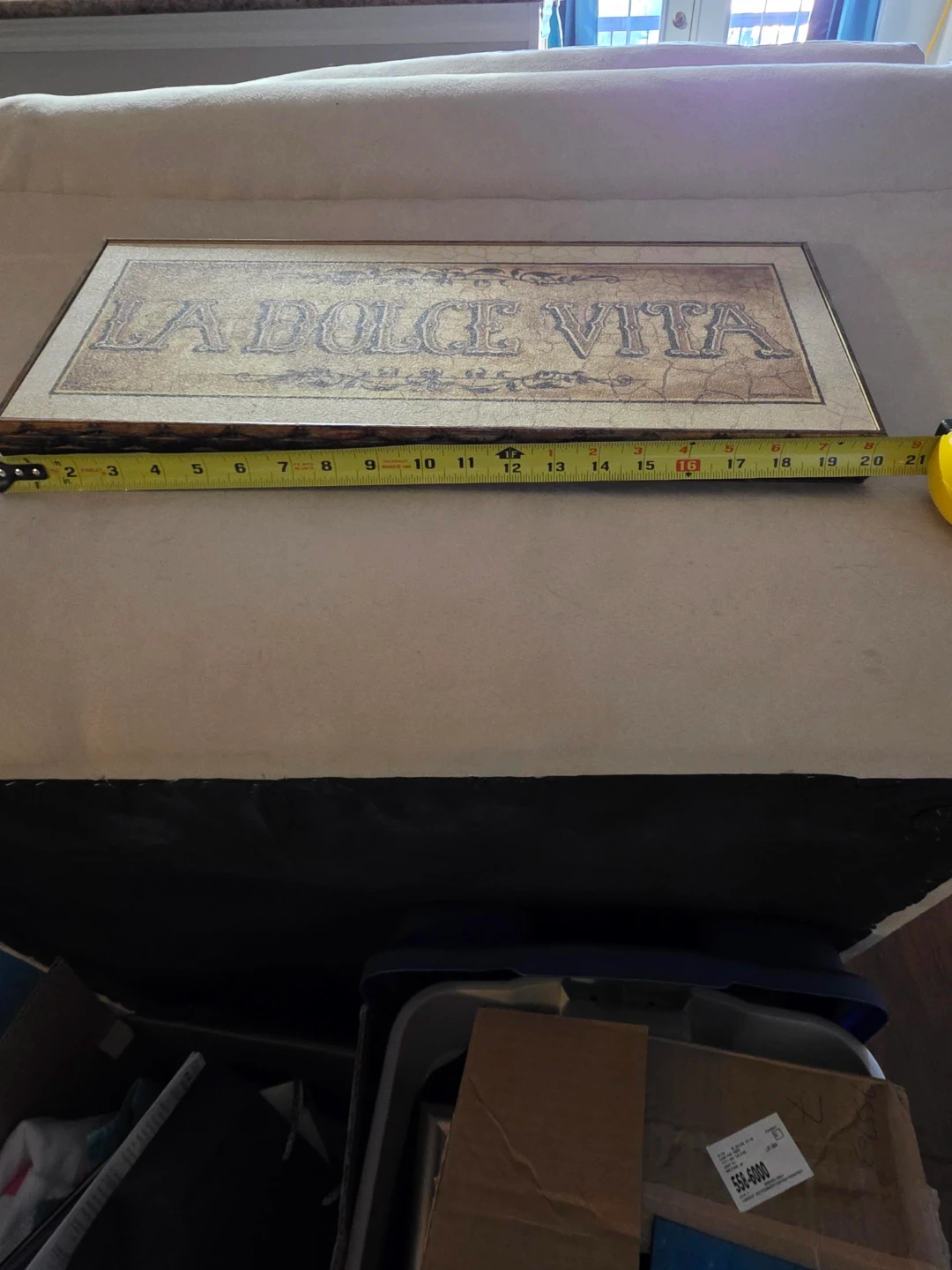 Decorative framed wall art featuring "La Dolce Vita" text. Measures approximately 21 inches long. Adds a touch of European charm to your decor.
