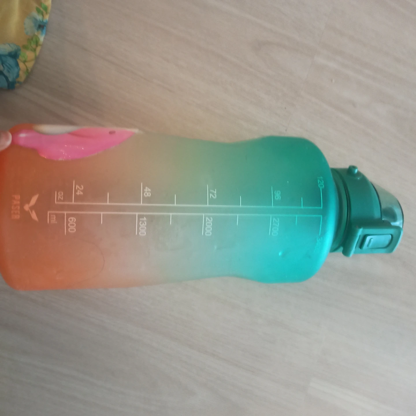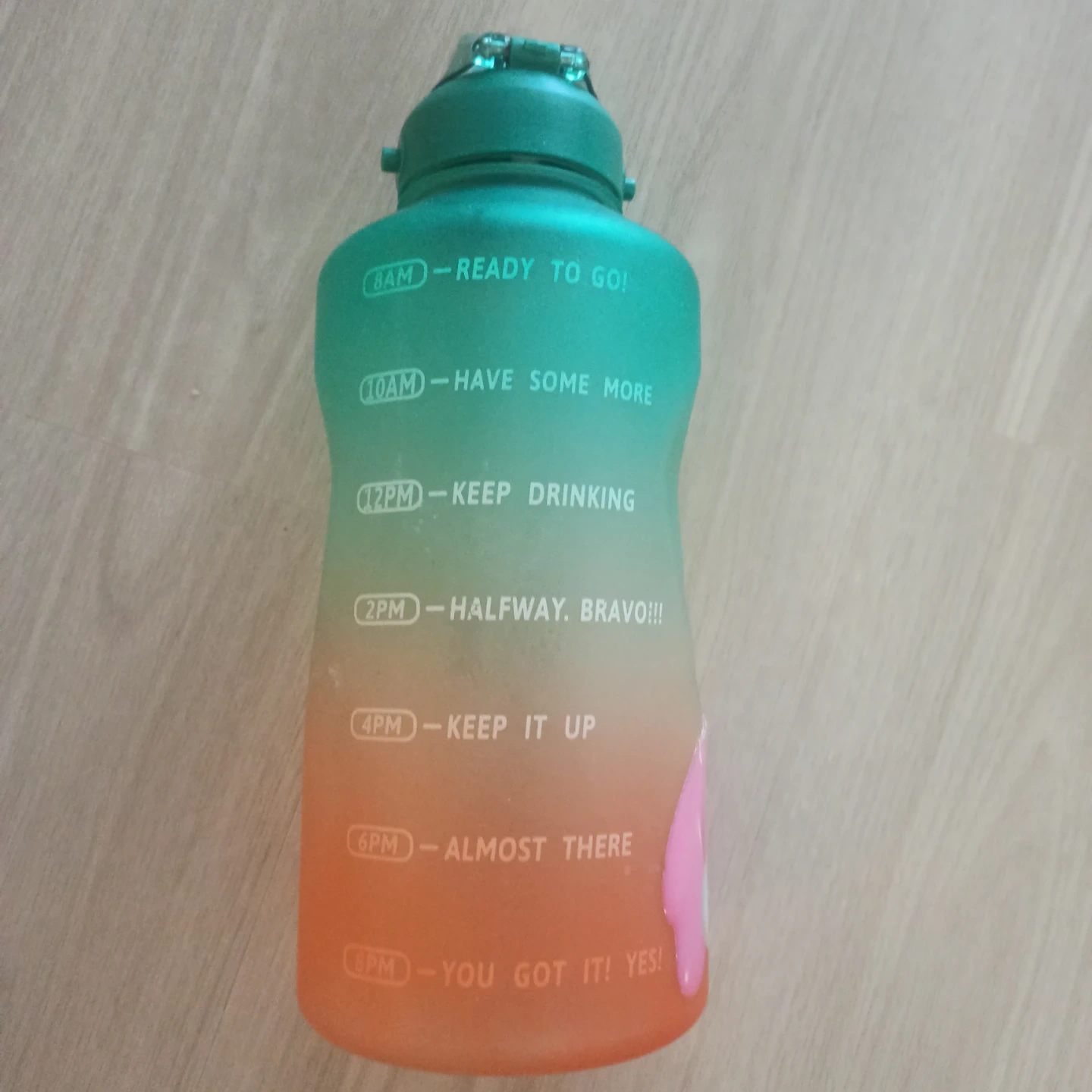 Selling a 2L water bottle! It features a gradient from green to orange, and has time markings to help you stay hydrated throughout the day. It's in great condition and ready for a new owner!