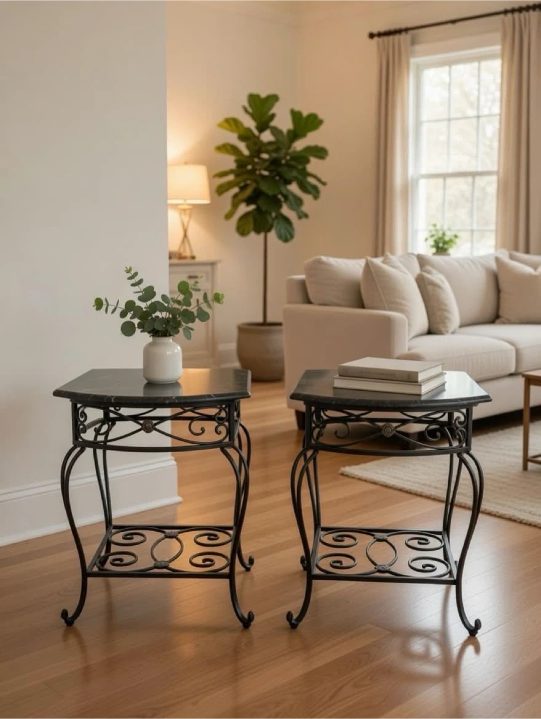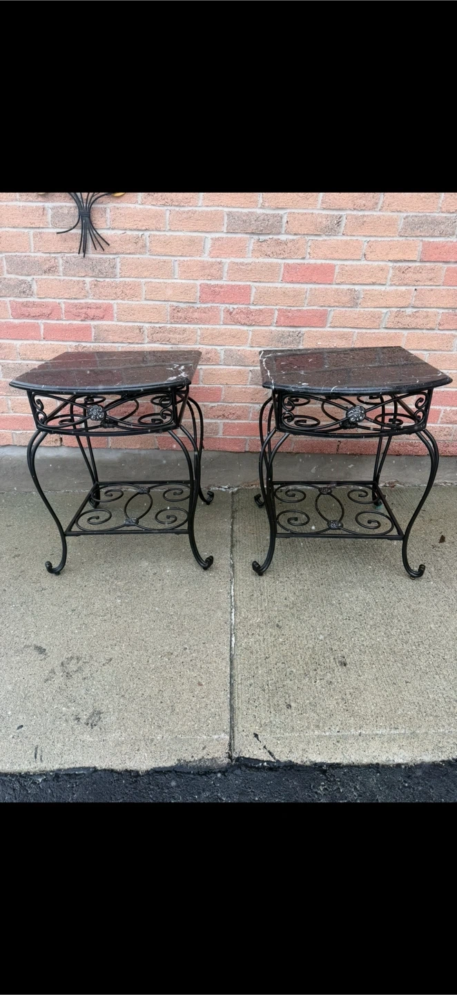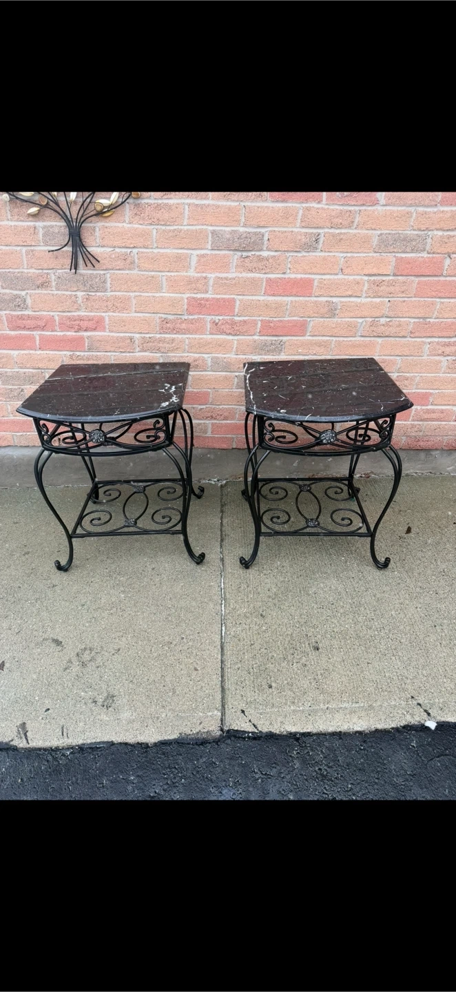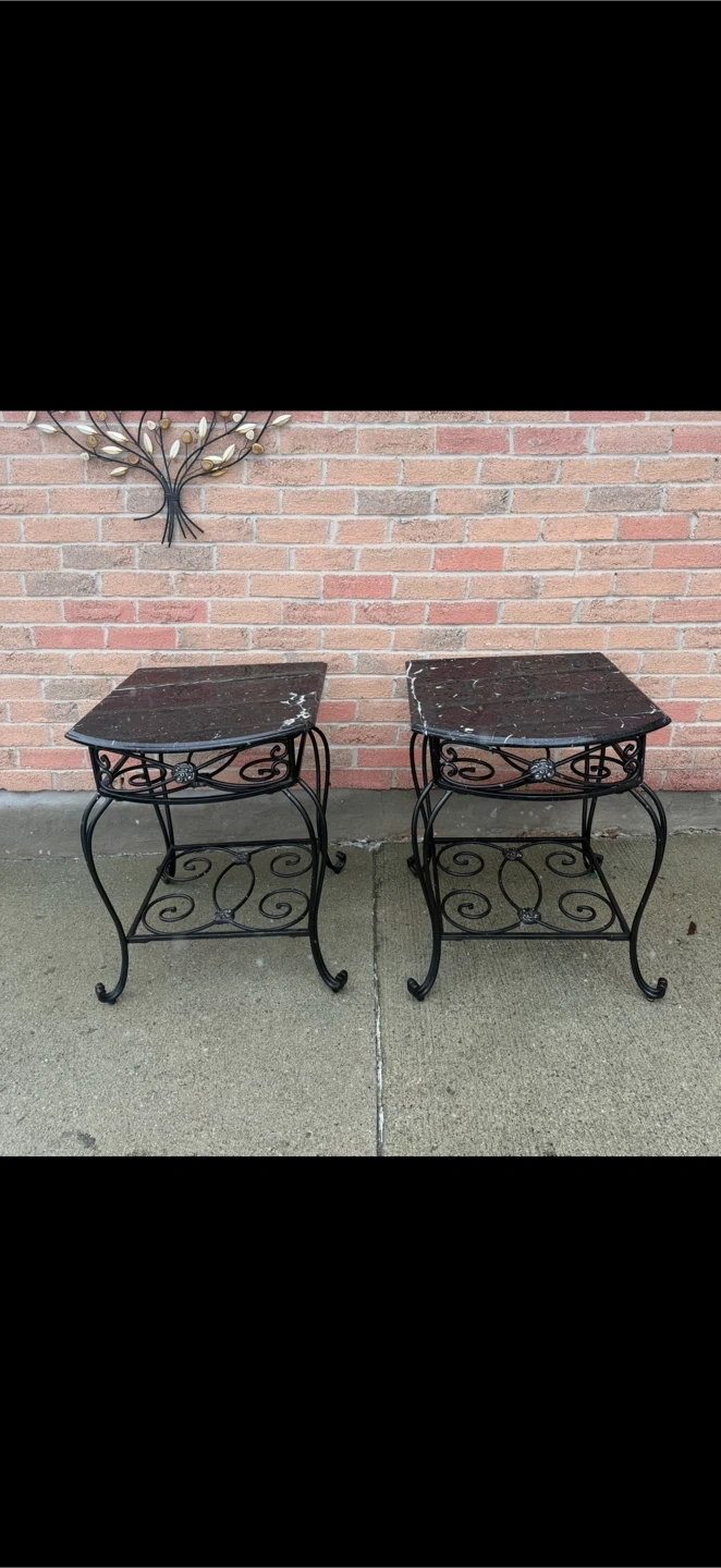 These two black marble table adds sophisticated charm to any décor with its ultrastylish all-black PC steel frame and Spanish Marquina black marble tabletop featuring distinctive vein, markings, and color variations exclusive to each piece, as each is crafted from organic stone.