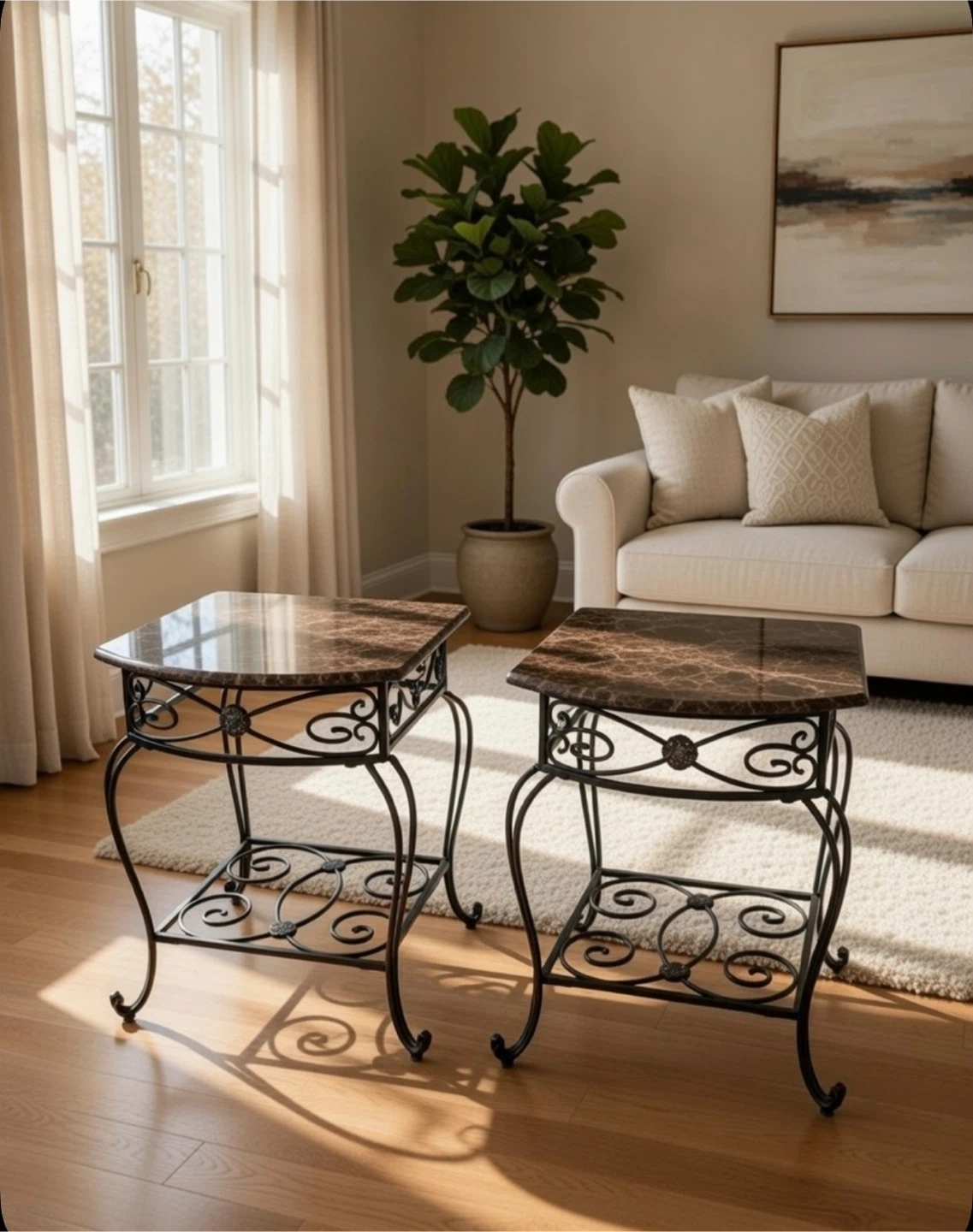 These two black marble table adds sophisticated charm to any décor with its ultrastylish all-black PC steel frame and Spanish Marquina black marble tabletop featuring distinctive vein, markings, and color variations exclusive to each piece, as each is crafted from organic stone.