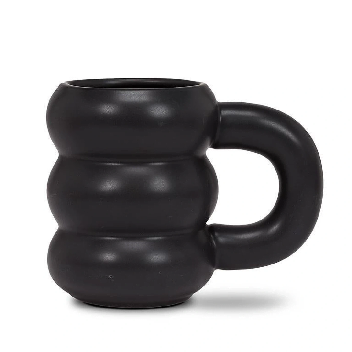 This unique black mug has a playful, puffed design. It's made of ceramic and has a sturdy handle for a comfortable grip. Great for your morning coffee or tea!