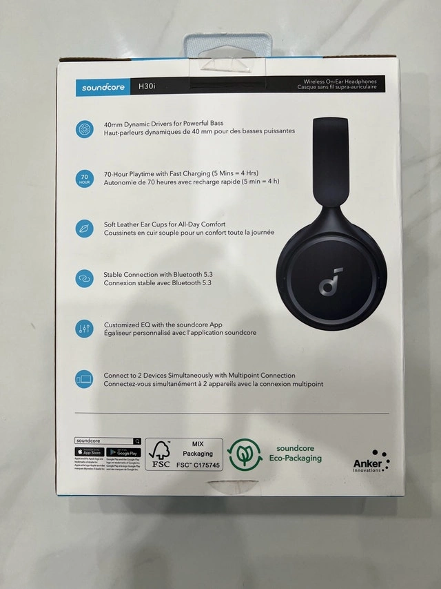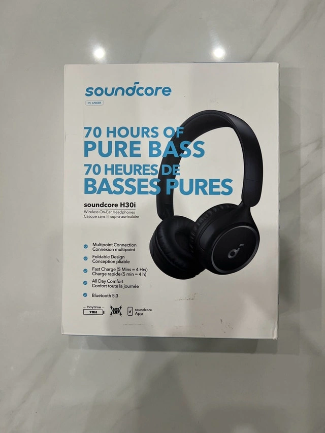 BRAND NEW (SEALED BOX) Soundcore H30i by Anker - 70 hours of play time - wireless on-ear headphones - bluetooth 5.3 - impressive bass (40mm driver) - multipoint connection - foldable design (light weight) - fast charge (5 mins = 4 hrs) - all day comfort. Condition: New. For Sale By: Owner.