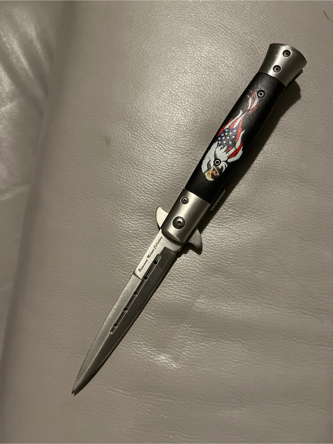 This knife features a striking eagle design with American flag elements on the handle. New and unused, no box nor papers included…..
