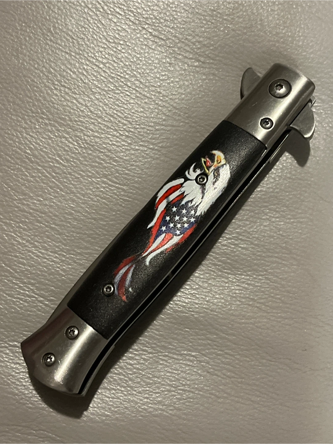 This knife features a striking eagle design with American flag elements on the handle. New and unused, no box nor papers included…..