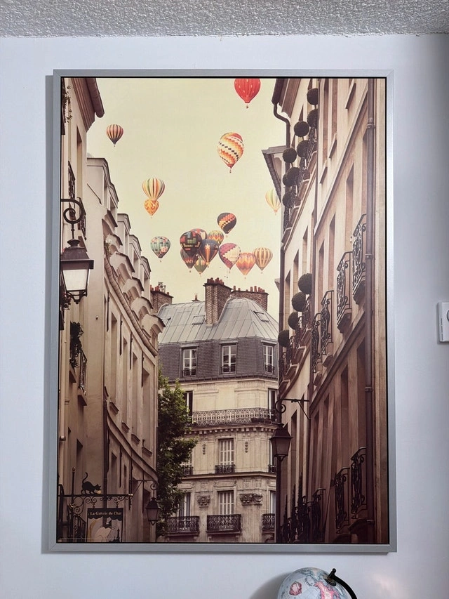 Add a touch of Parisian charm to your space with this captivating wall art, showcasing a picturesque street scene adorned with vibrant hot air balloons. This print is in good condition and would be a delightful addition to any room, bringing a sense of wanderlust and whimsy. The dimensions are 40"x55". I'm asking $110 for this piece. If the ad is still up, it's still available!