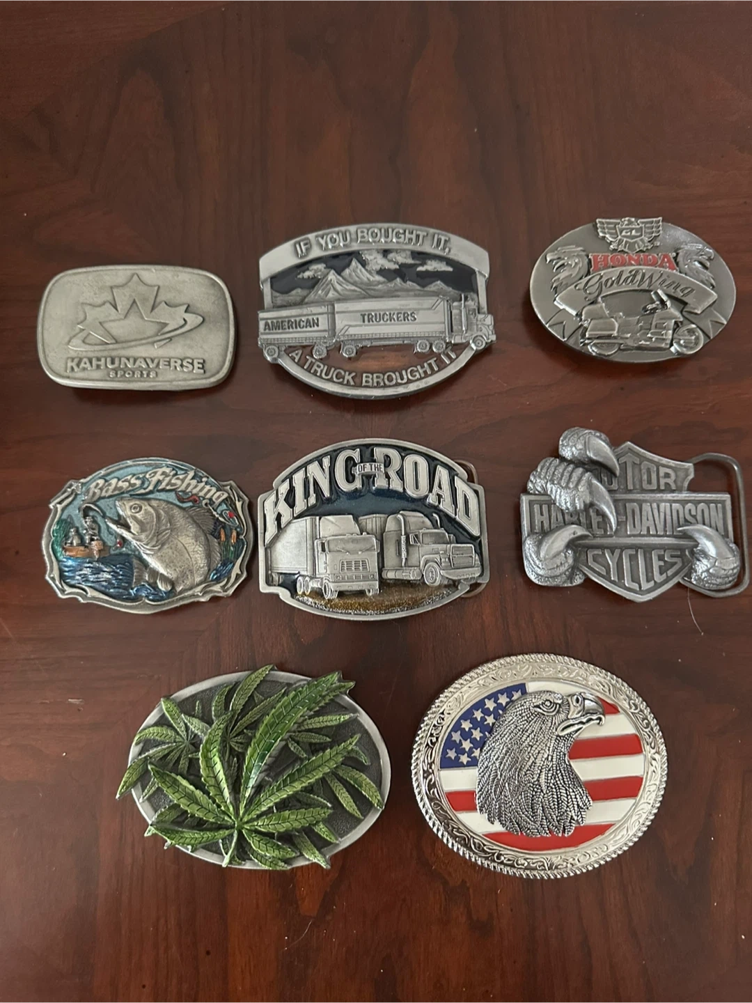 Collection of cool belt buckles featuring various designs. Includes American Truckers, King Road, Bass Fishing, Harley Davidson Motorcycles, Honda Gold Wing, a cannabis leaf, and an American Eagle with flag. Great for collectors or to add some flair to your outfit! Priced per buckle, smoke free home.