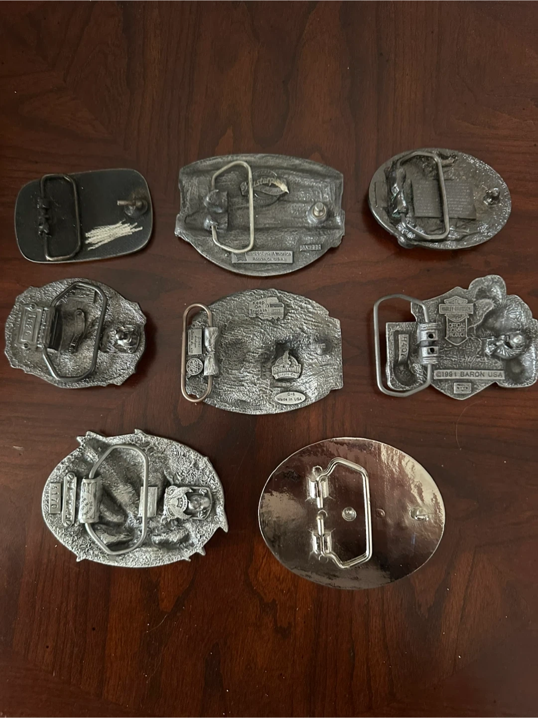 Collection of cool belt buckles featuring various designs. Includes American Truckers, King Road, Bass Fishing, Harley Davidson Motorcycles, Honda Gold Wing, a cannabis leaf, and an American Eagle with flag. Great for collectors or to add some flair to your outfit! Priced per buckle, smoke free home.