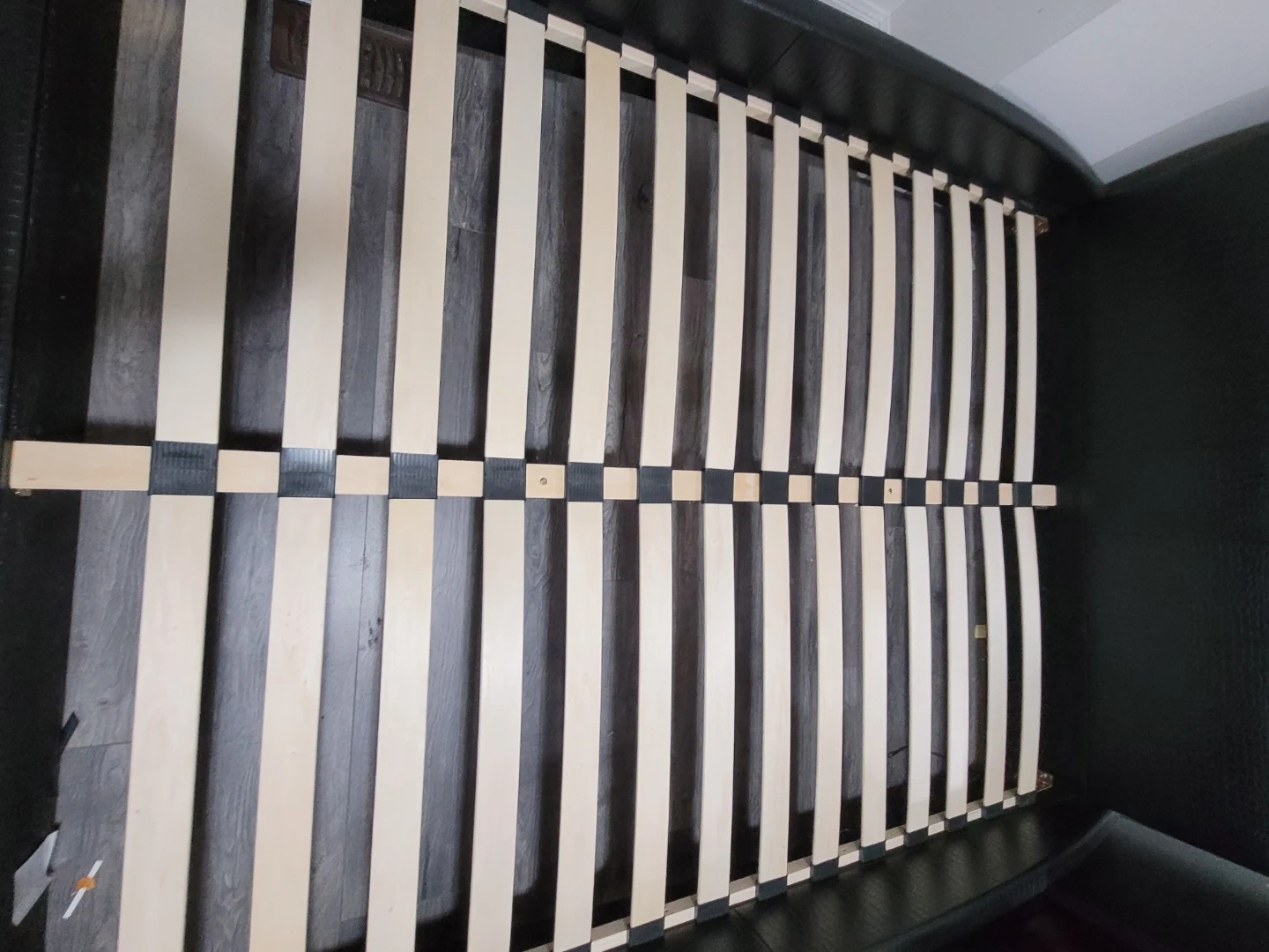 Selling a black bed frame with a faux leather finish. It has a unique headboard design with built-in cushions for extra comfort. The frame is sturdy and in good condition!