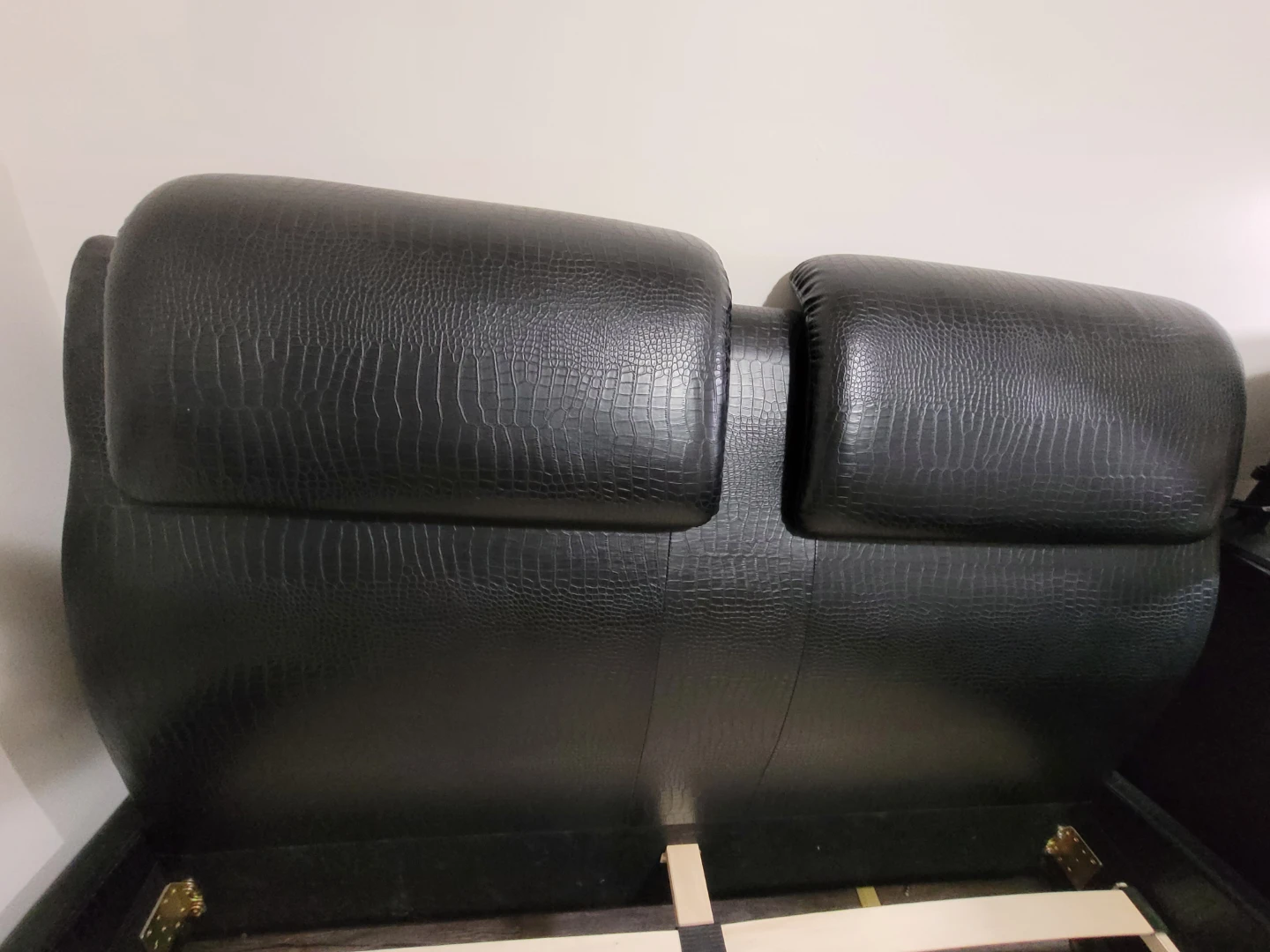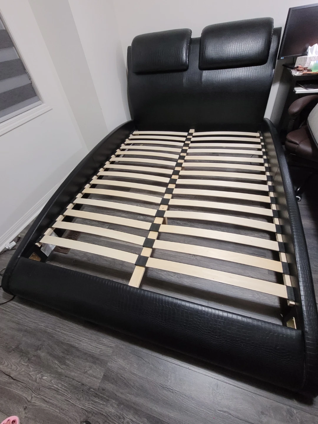 Selling a black bed frame with a faux leather finish. It has a unique headboard design with built-in cushions for extra comfort. The frame is sturdy and in good condition!