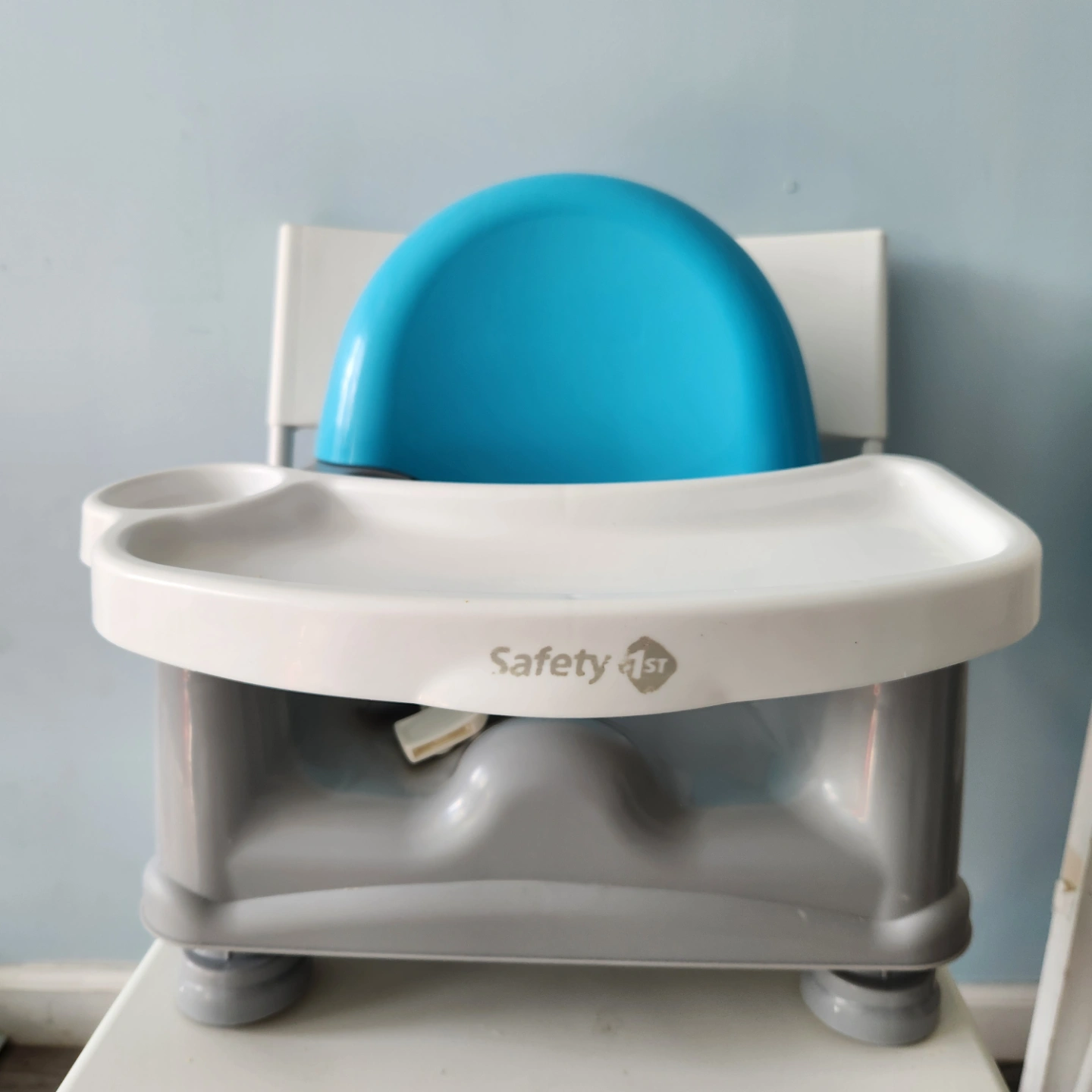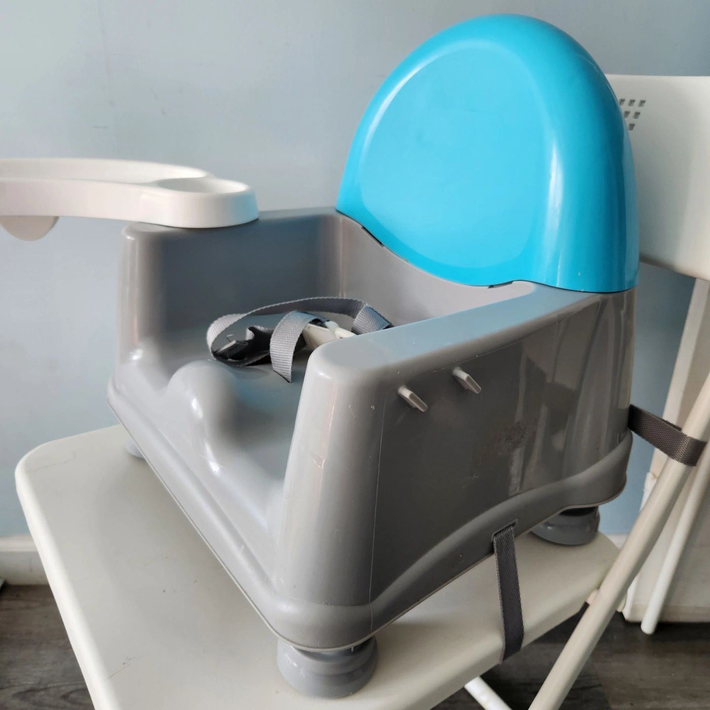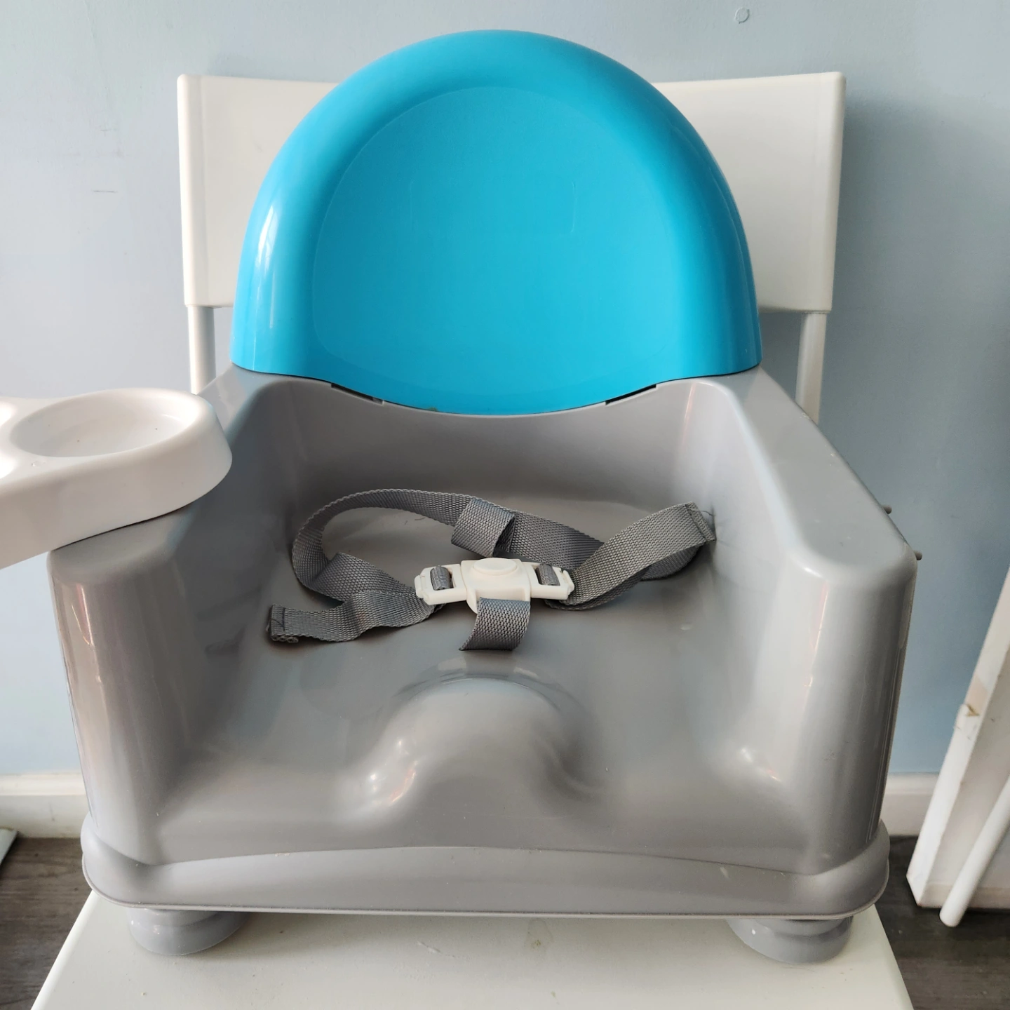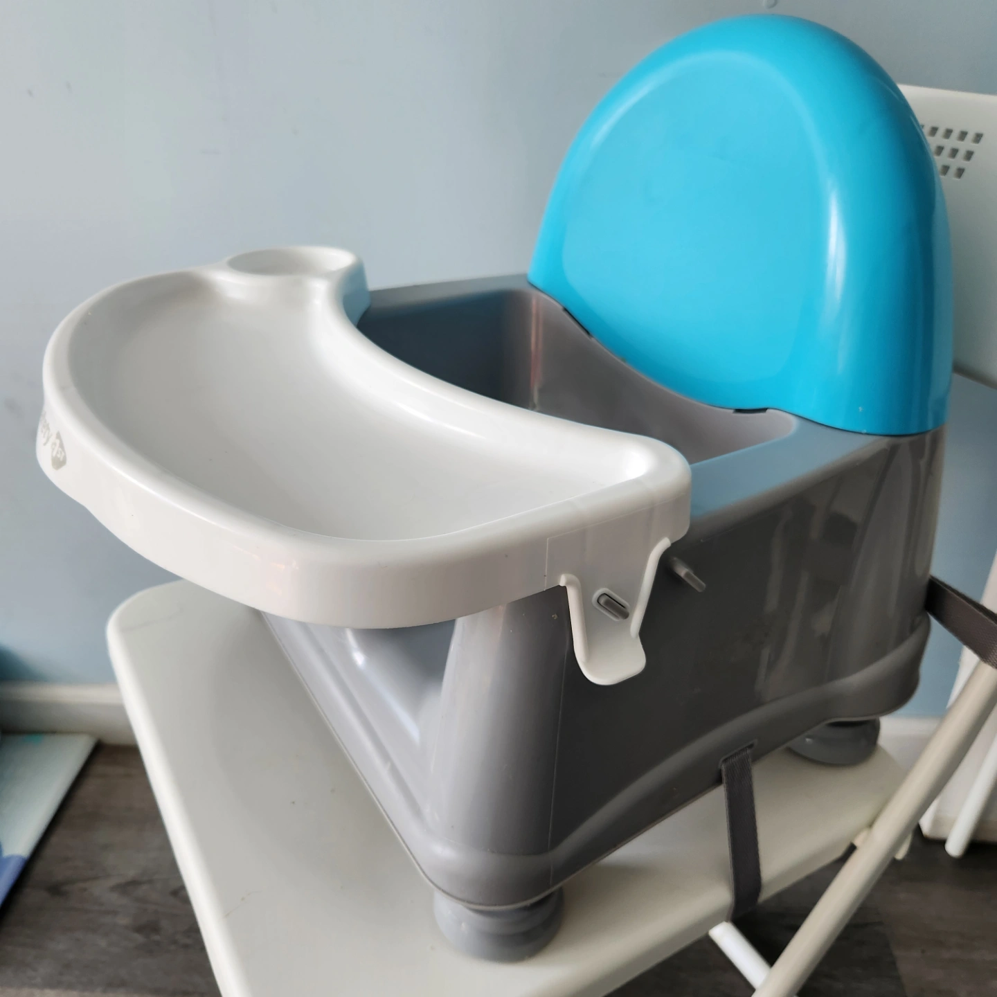 Portable booster seat. Easy to clean. Great for toddlers. Includes tray and straps.