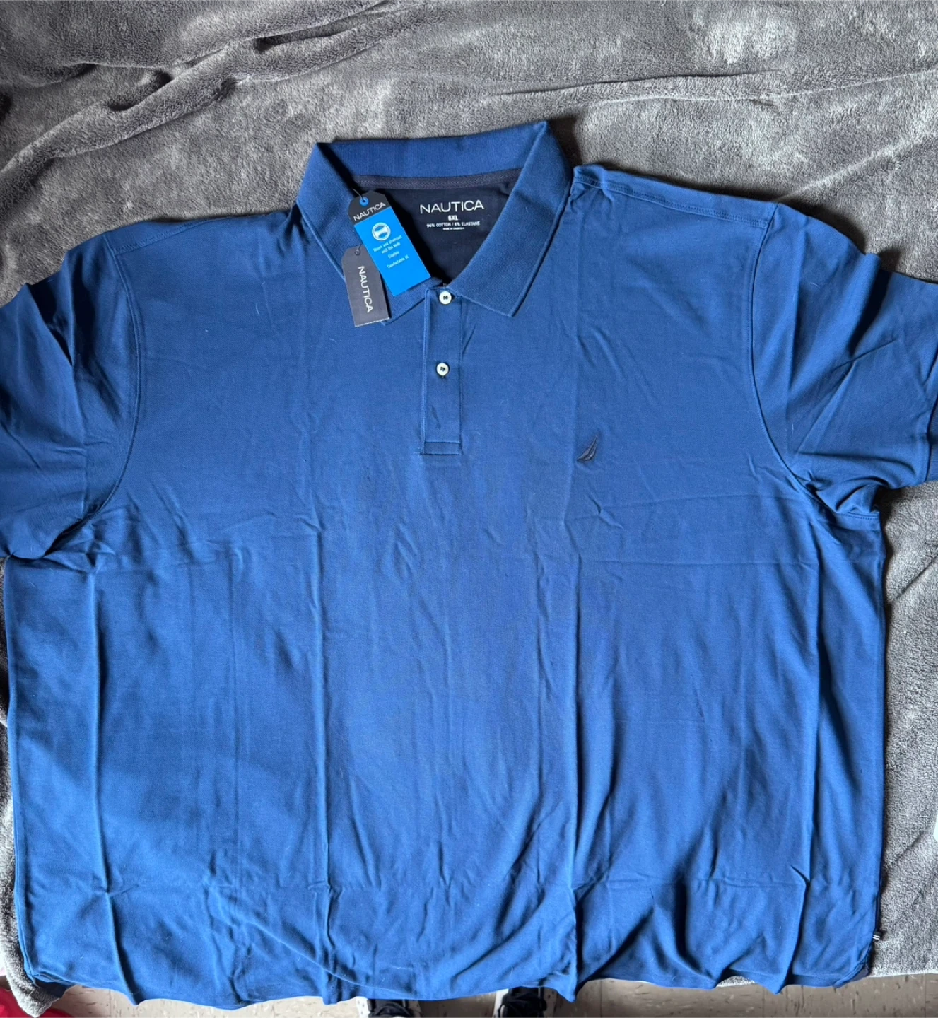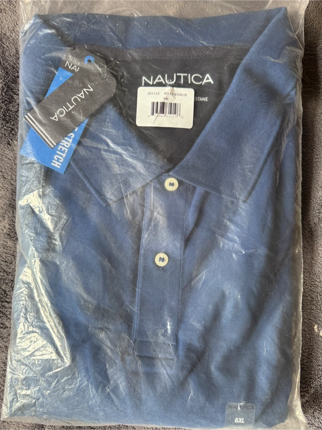 This is a brand new Nautica polo shirt in size 6XL! The color is a beautiful estate blue. It's made of 96% cotton and 4% elastane, so it moves and stretches with you for a comfortable fit.