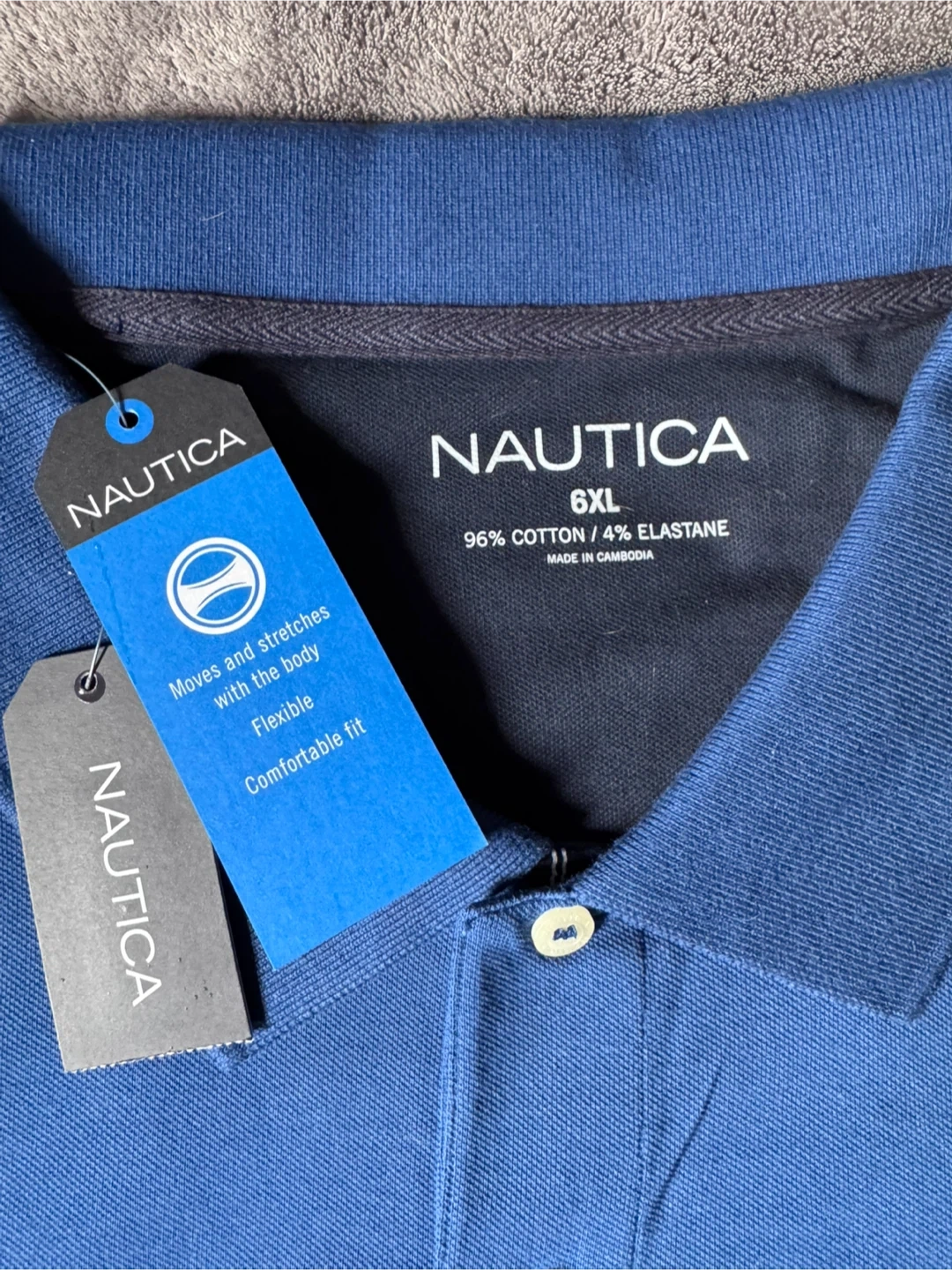 This is a brand new Nautica polo shirt in size 6XL! The color is a beautiful estate blue. It's made of 96% cotton and 4% elastane, so it moves and stretches with you for a comfortable fit.