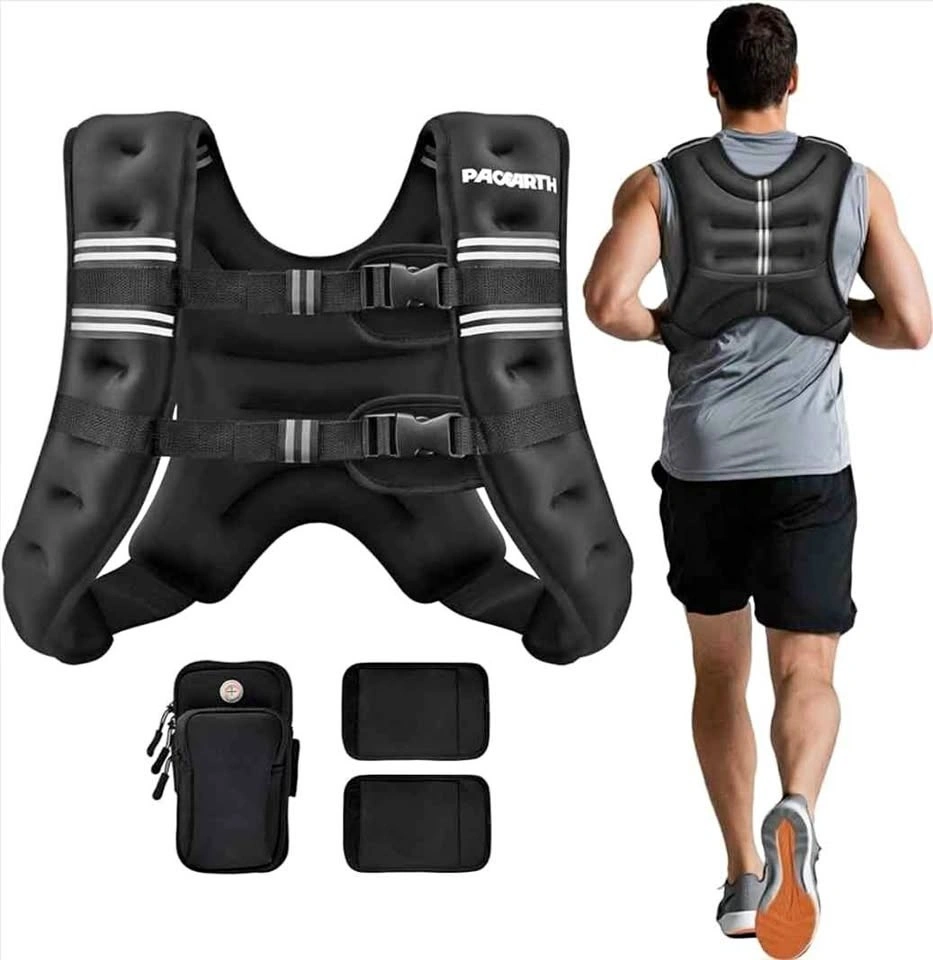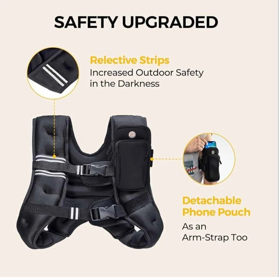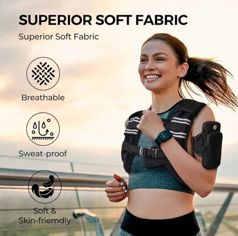Versatile weighted vest for workouts. Has reflective strips for outdoor safety. Comes with detachable phone pouch, use on vest or as arm strap. Made with soft, breathable, sweat-proof fabric. Has comfy shoulder pads and padded buckles for good fit.