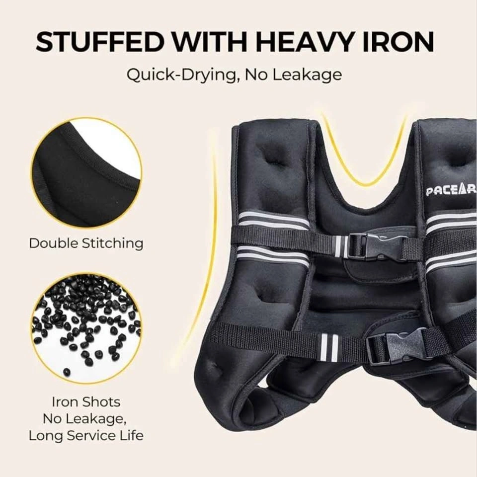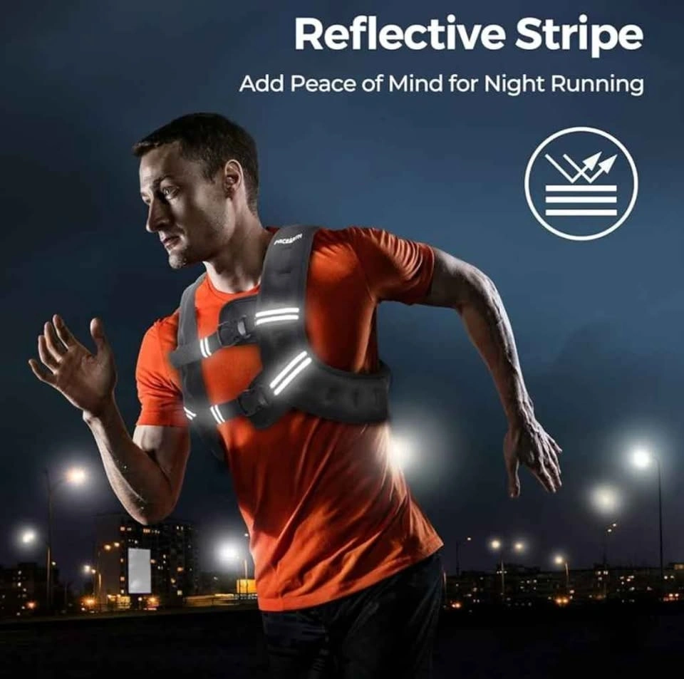 Versatile weighted vest for workouts. Has reflective strips for outdoor safety. Comes with detachable phone pouch, use on vest or as arm strap. Made with soft, breathable, sweat-proof fabric. Has comfy shoulder pads and padded buckles for good fit.