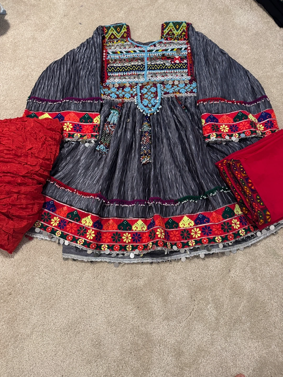 This is a gray dress featuring intricate embroidery along the neckline, sleeves, and hem. It has colorful floral patterns and beaded details. Includes a matching red scarf or wrap.
