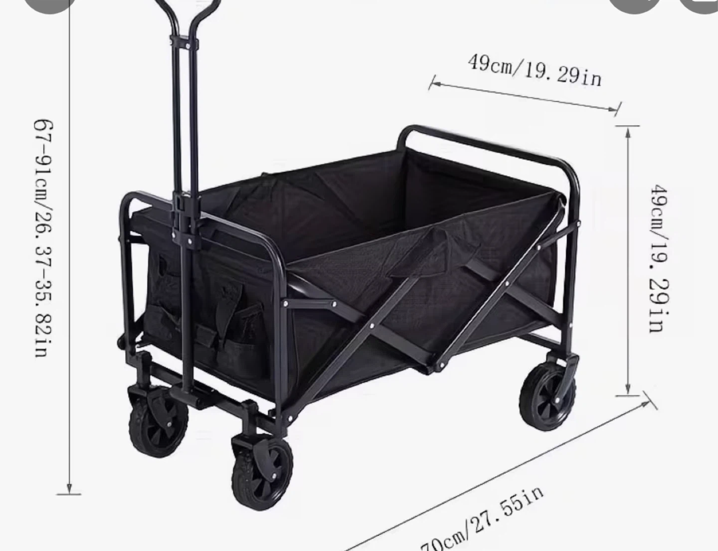 This is a black folding wagon. It measures 49cm x 49cm x 70cm. The handle height is adjustable from 67-91cm. It's made of fabric and metal. Carry 350 pounds. Unpacked, never used.
