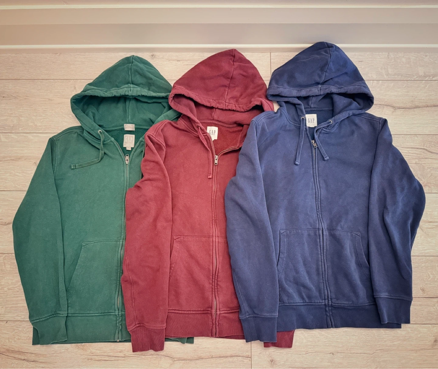 Three GAP zip-up hoodies, each in a different colour: green, burgundy, and navy. They're made of a soft cotton blend, perfect for everyday wear. These are great for layering on cooler days!