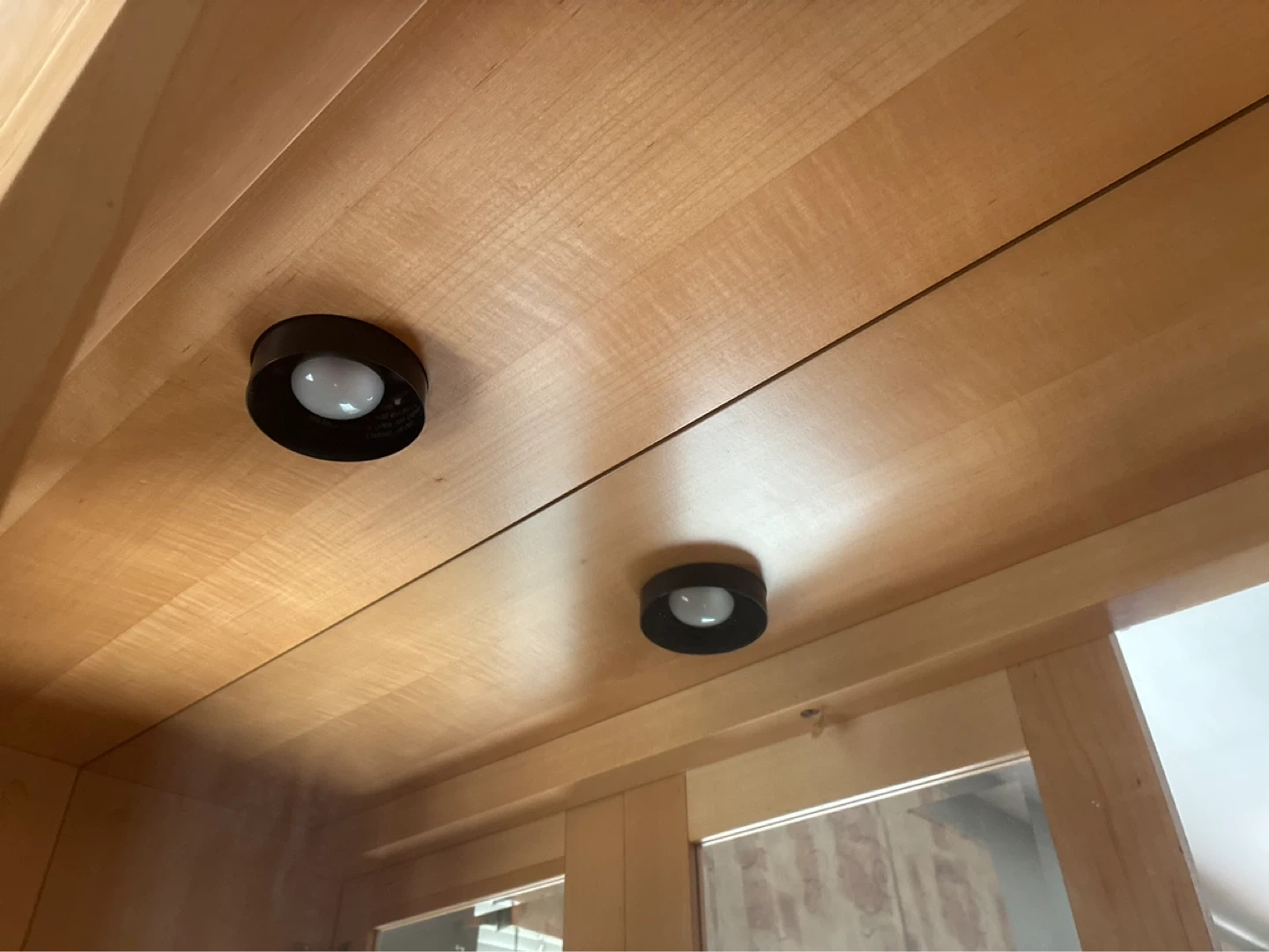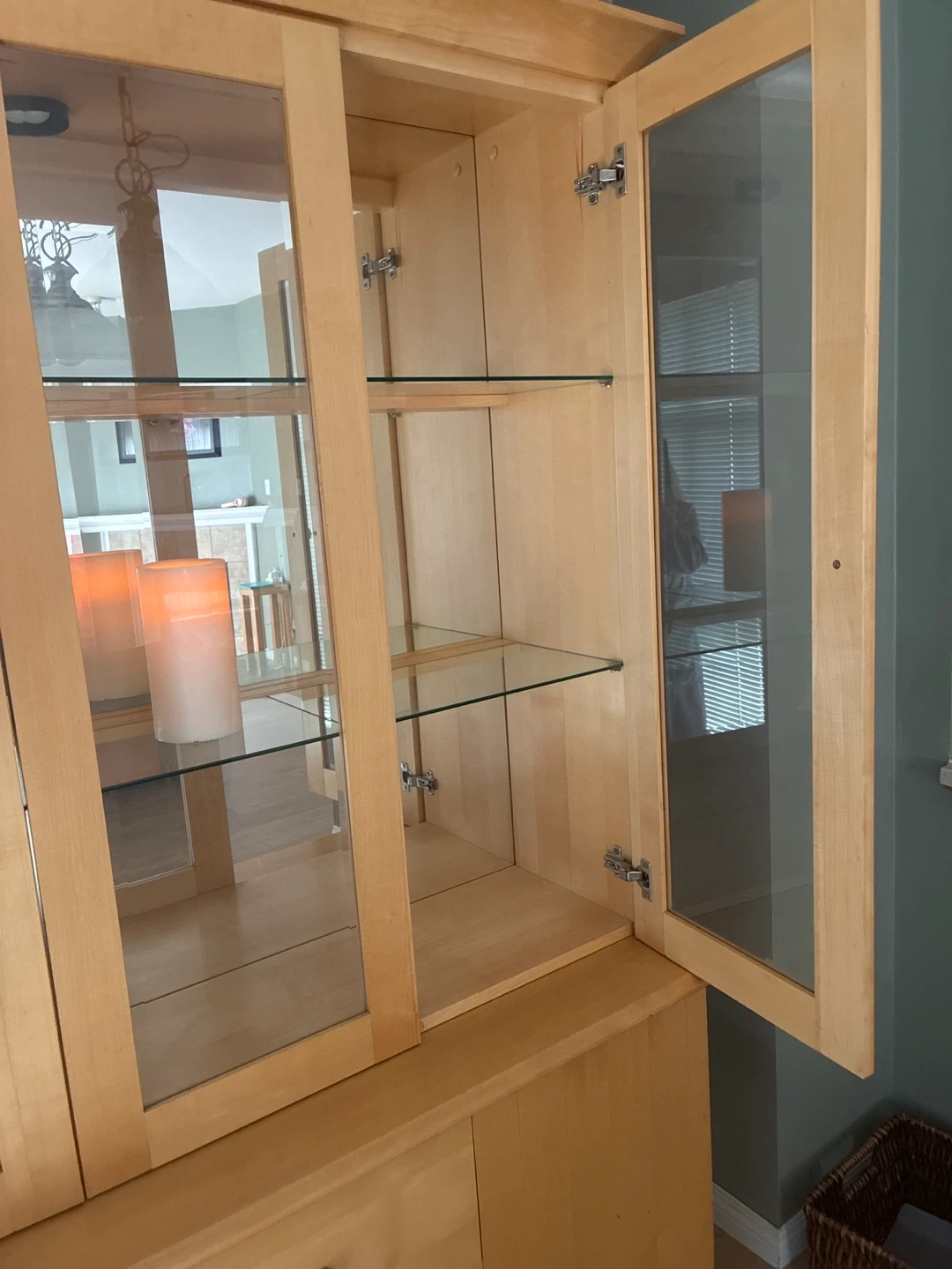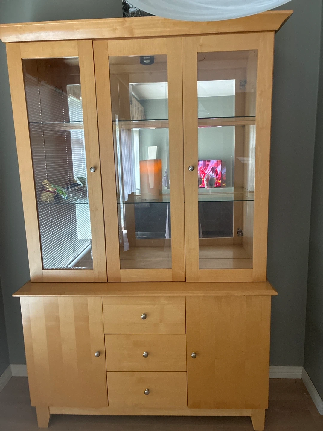 This china cabinet features a light maple wood finish with glass doors on top and solid doors on the bottom. It includes built-in interior lighting. Plenty of shelf space for displaying your items!