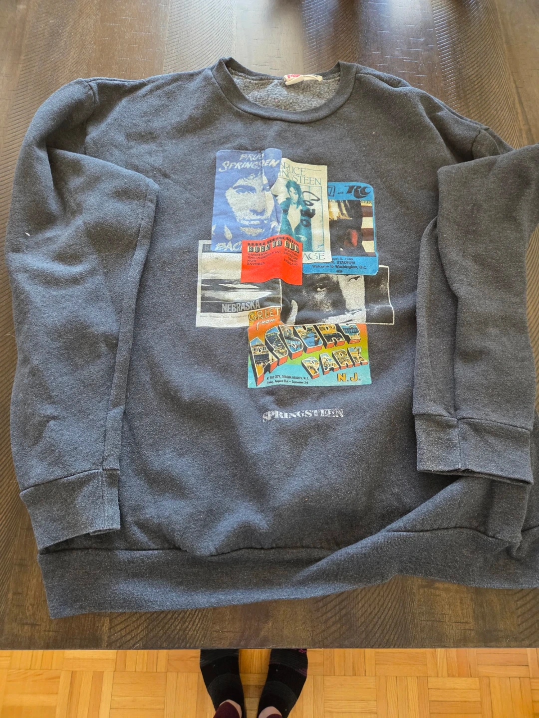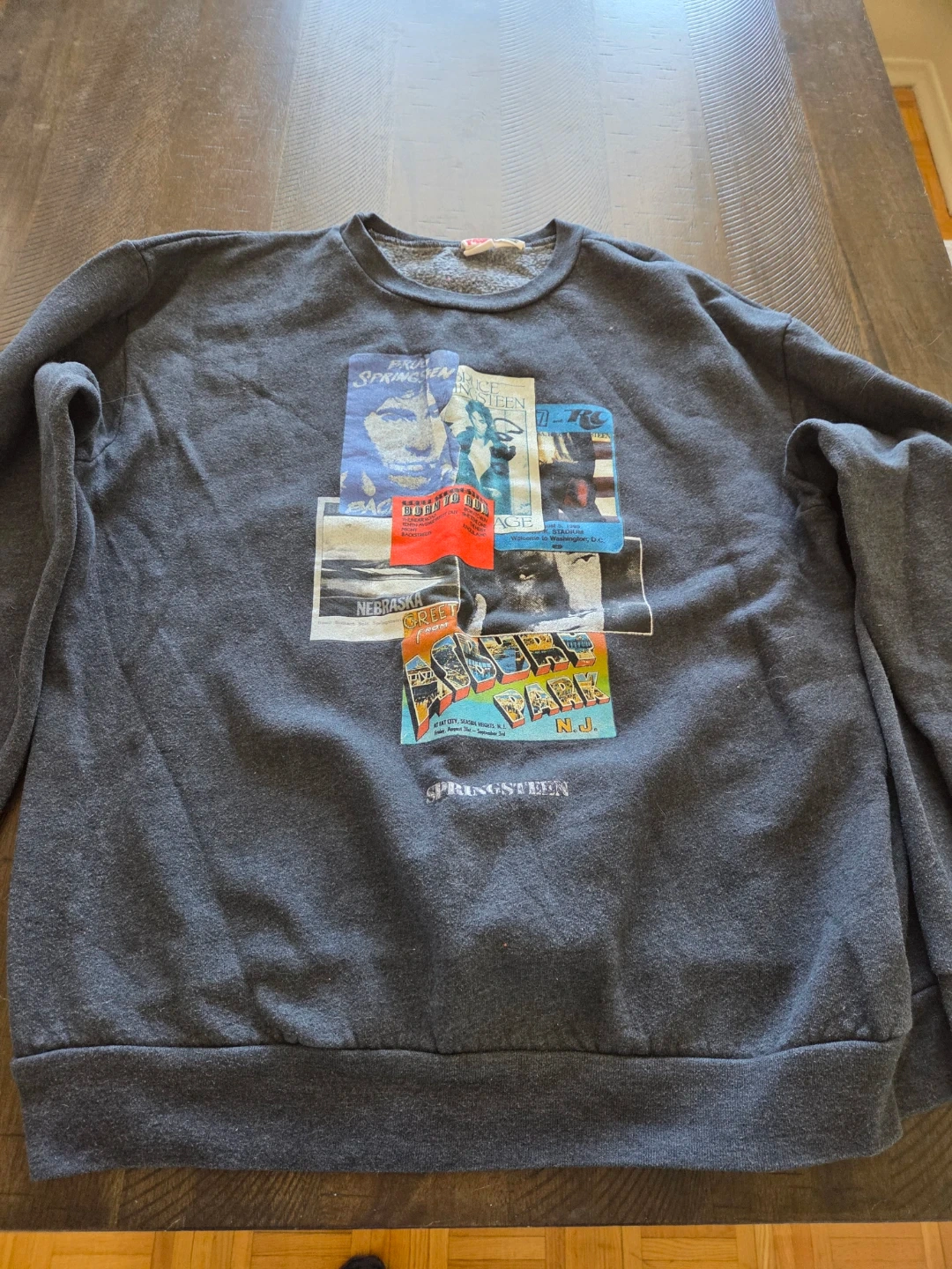 Grey crewneck sweatshirt featuring a collage of Bruce Springsteen album art and tour graphics. It's an XL size with long sleeves. This sweatshirt is great for any Bruce Springsteen fan! It is make in the USA and is from American Apparel